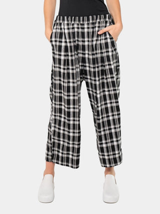Relaxed plaid trousers with an elastic waistband and cropped length. Designed with a loose fit and side pockets for easy, everyday wear.