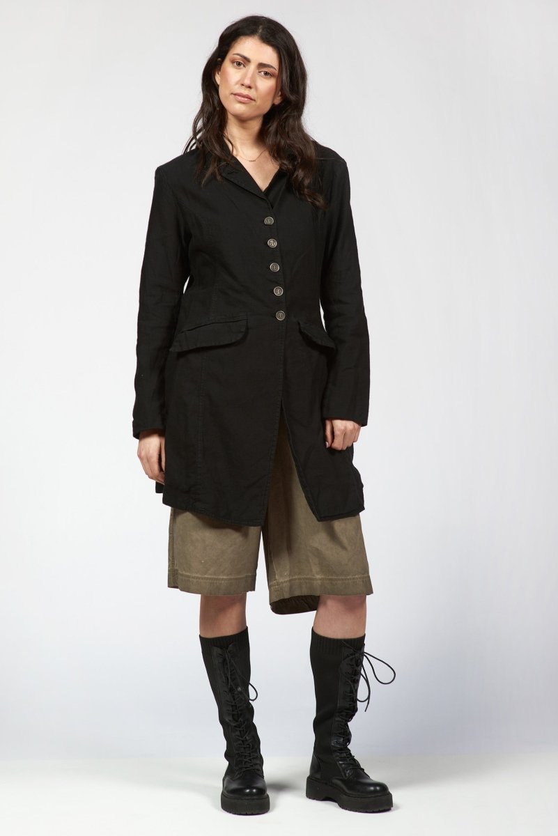 Keep warm in this jacket featuring a high collar, seven gleaming metallic buttons, and a tailored silhouette that hugs in all the right places. The slightly flared hem adds graceful movement, while the flap pockets offer both style and practicality.