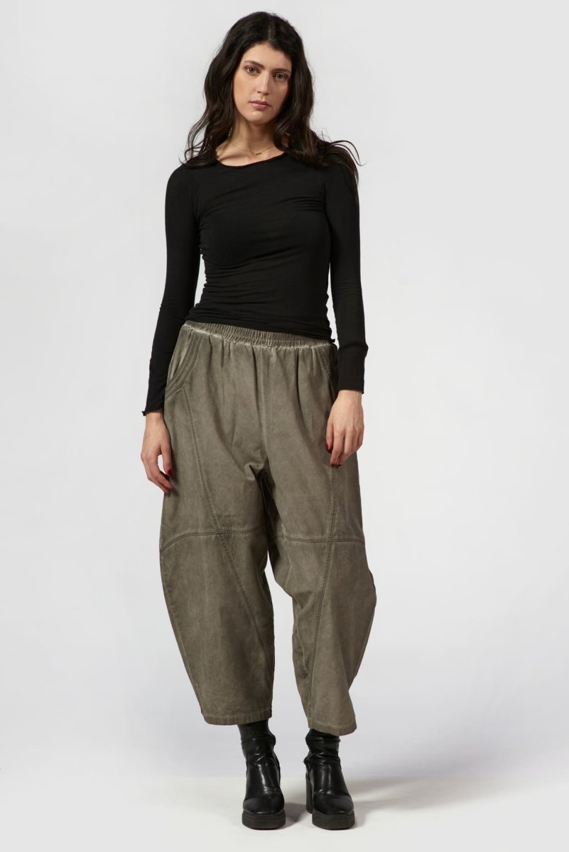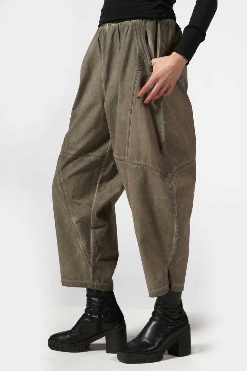 Crafted from a washed, weightless fabric, they move with you—breathing, bending, and draping in all the right places. Intricate decorative stitching traces the seams like delicate hand-drawn lines. The elasticated waist rests comfortably against your skin. The sculpted volume curves gently away from the leg before narrowing at the ankle.