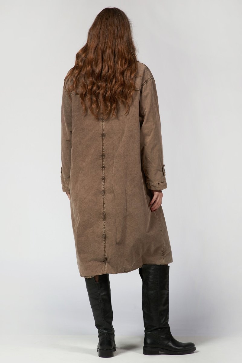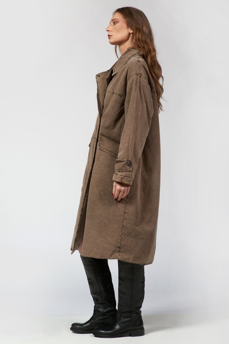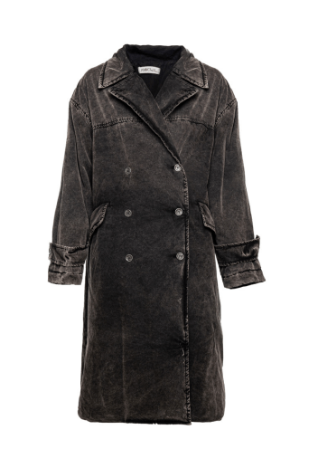 Long coat tailored in a structured cotton-blend fabric with a smooth, matte finish. Features a double-breasted front with six buttons and a straight silhouette that falls below the knee. Refined detailing and minimal lines emphasize proportion and balance.