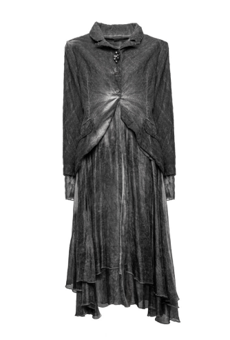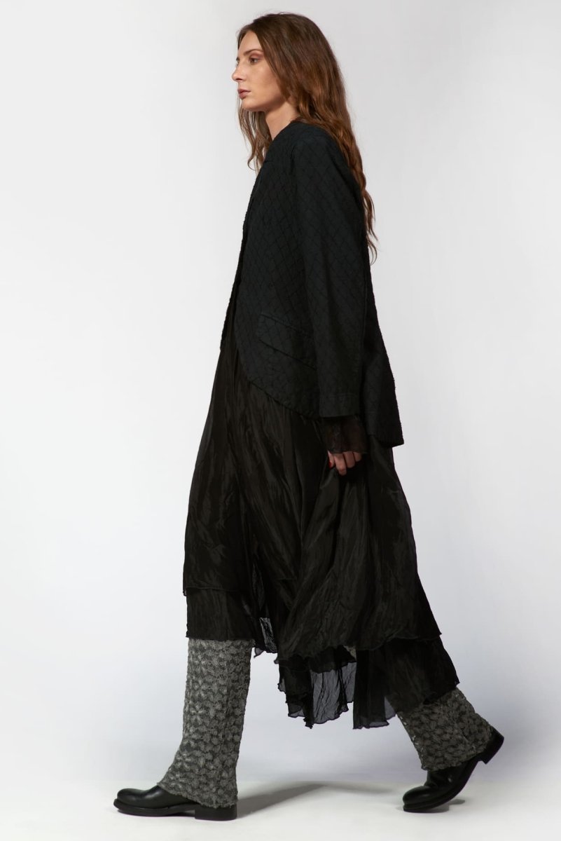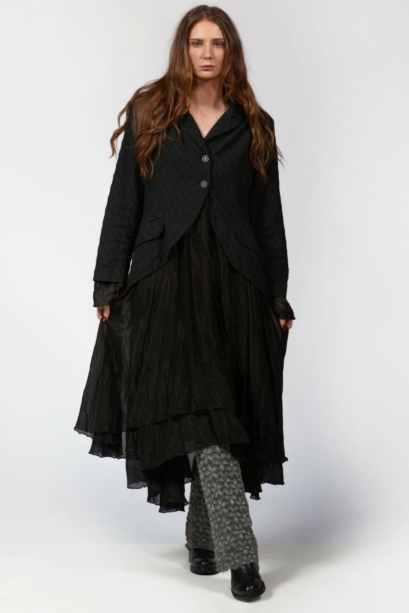 Romantic and artfully constructed, this needled diamond jacket is designed to move beautifully with the body. The dress features a draped, gathered bodice that creates dimension and a naturally flattering shape at the waist. The silhouette flows into a tiered, asymmetrical hem with a decorative brooch.