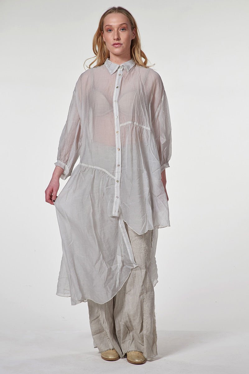 An asymmetric cut brings a sense of modern ease to this tunic, creating fluid movement and visual intrigue. The elongated lines drape softly over the body, balancing structure with lightness. Designed for a quietly confident, architectural look.