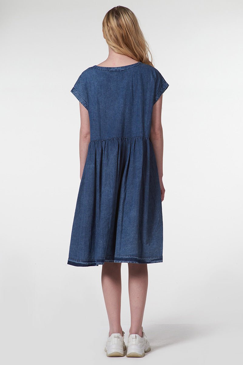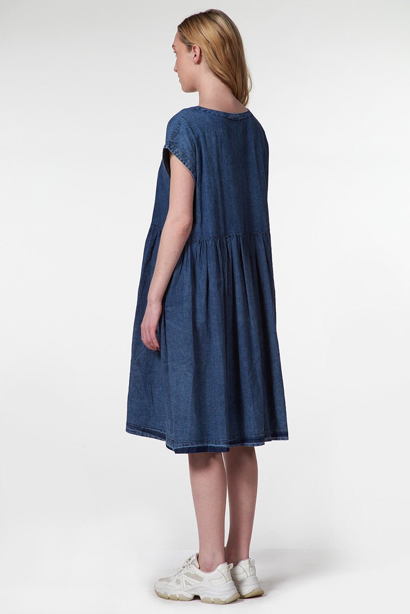 Crafted from premium denim, this dress features a flattering V-neckline that elongates the silhouette, while delicate cap sleeves add a soft, feminine finish. Designed with clean lines and a fluid drape, it balances structure and ease for all-day comfort and timeless  appeal.