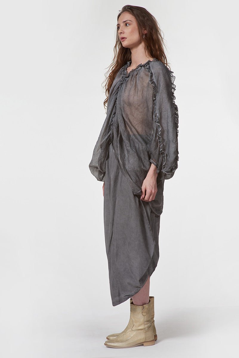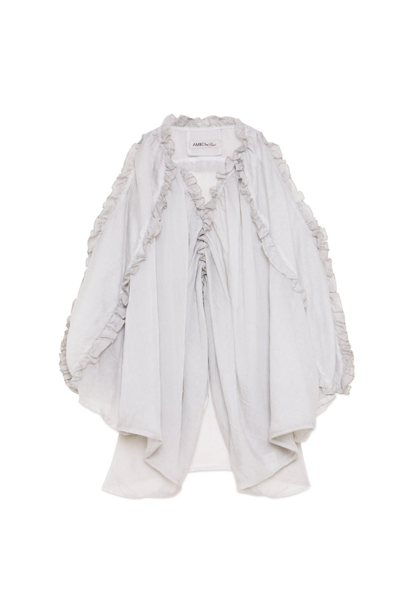 Effortlessly feminine and graceful, this blouse drapes beautifully for a soft, fluid silhouette.The kimono-style sleeves offer sophistication, while delicate ruffle detailing adds a touch of romantic refinement. Designed with clean lines and thoughtful proportions, this luxury blouse is a must have in your closet.