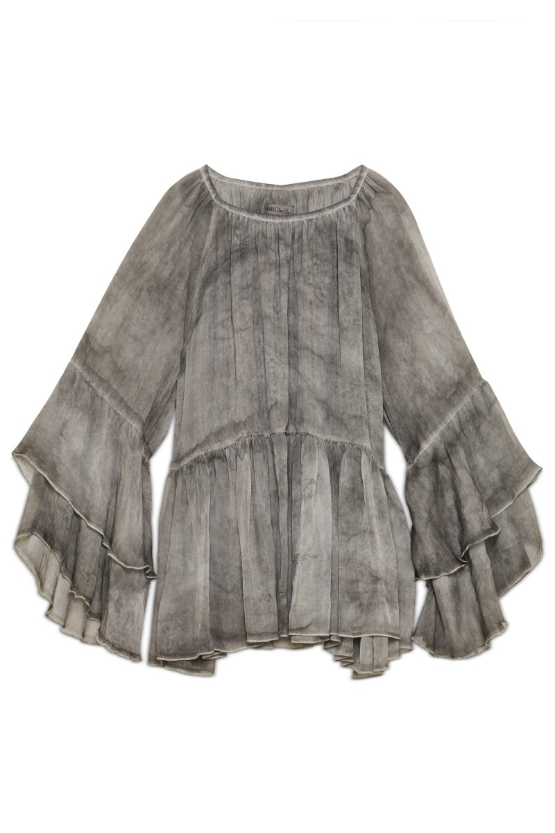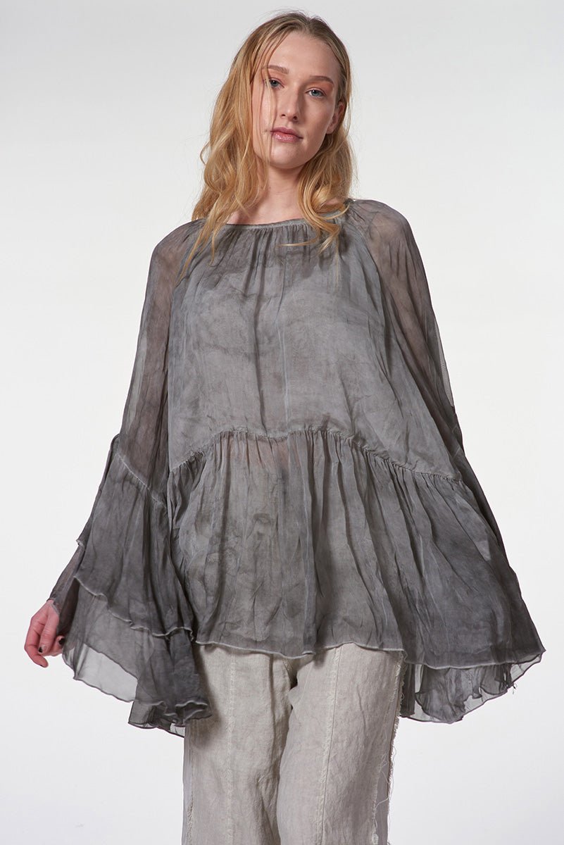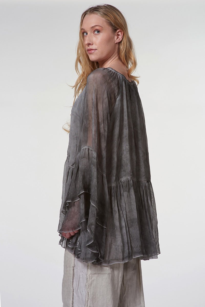 Feminine sophistication meets chic in this blouse. Crafted from the softest lightweight fabric, this blouse offers a soft, breathable feel and a fluid drape for effortless elegance. The raglan cut ensures a comfortable fit, while the ruffled sleeves add a delicate, fashion-forward detail that elevates the silhouette.