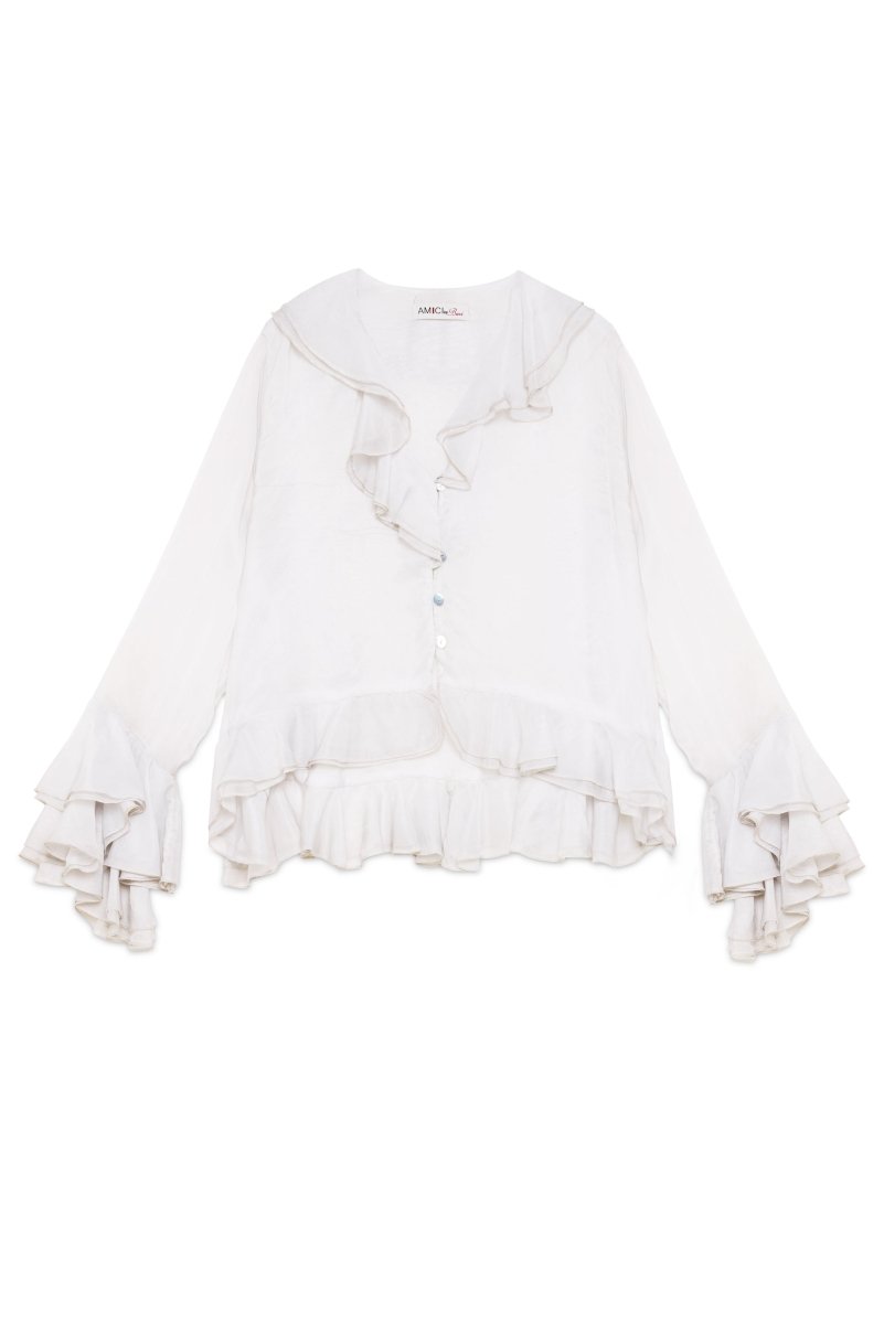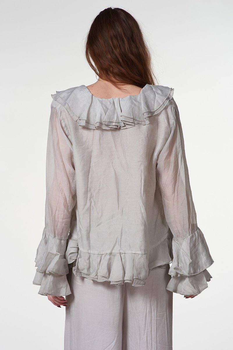 Classy yet fun, this shirt offers a soft, breathable feel and a fluid drape, perfect for elevated casual or professional workwear styling. The ruffled detailing adds subtle volume and a touch of femininity, enhancing the silhouette while maintaining a sleek, contemporary aesthetic.