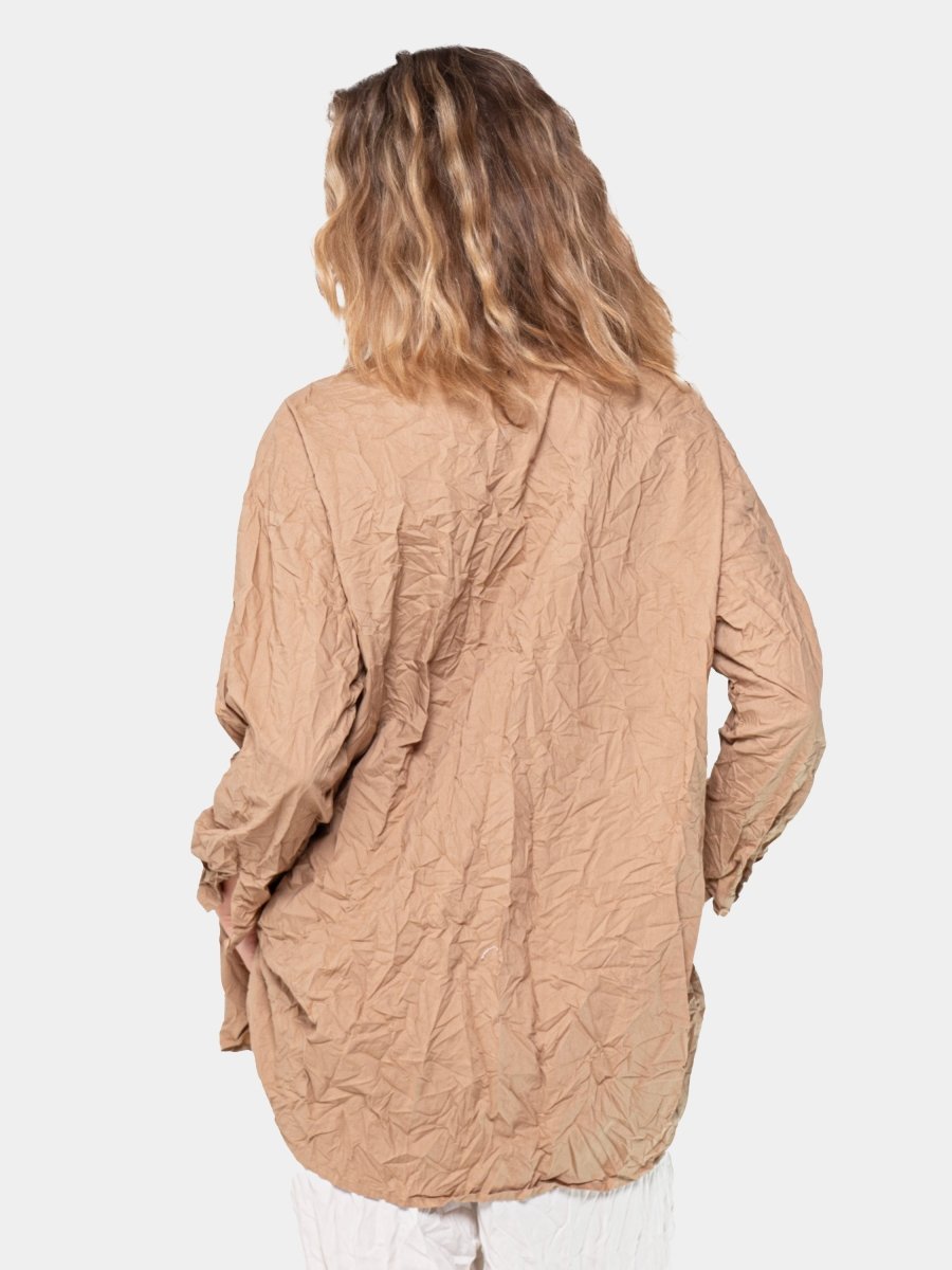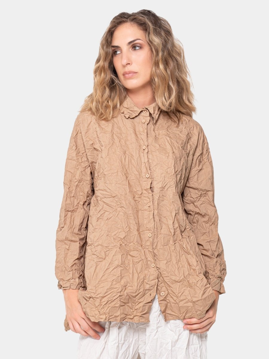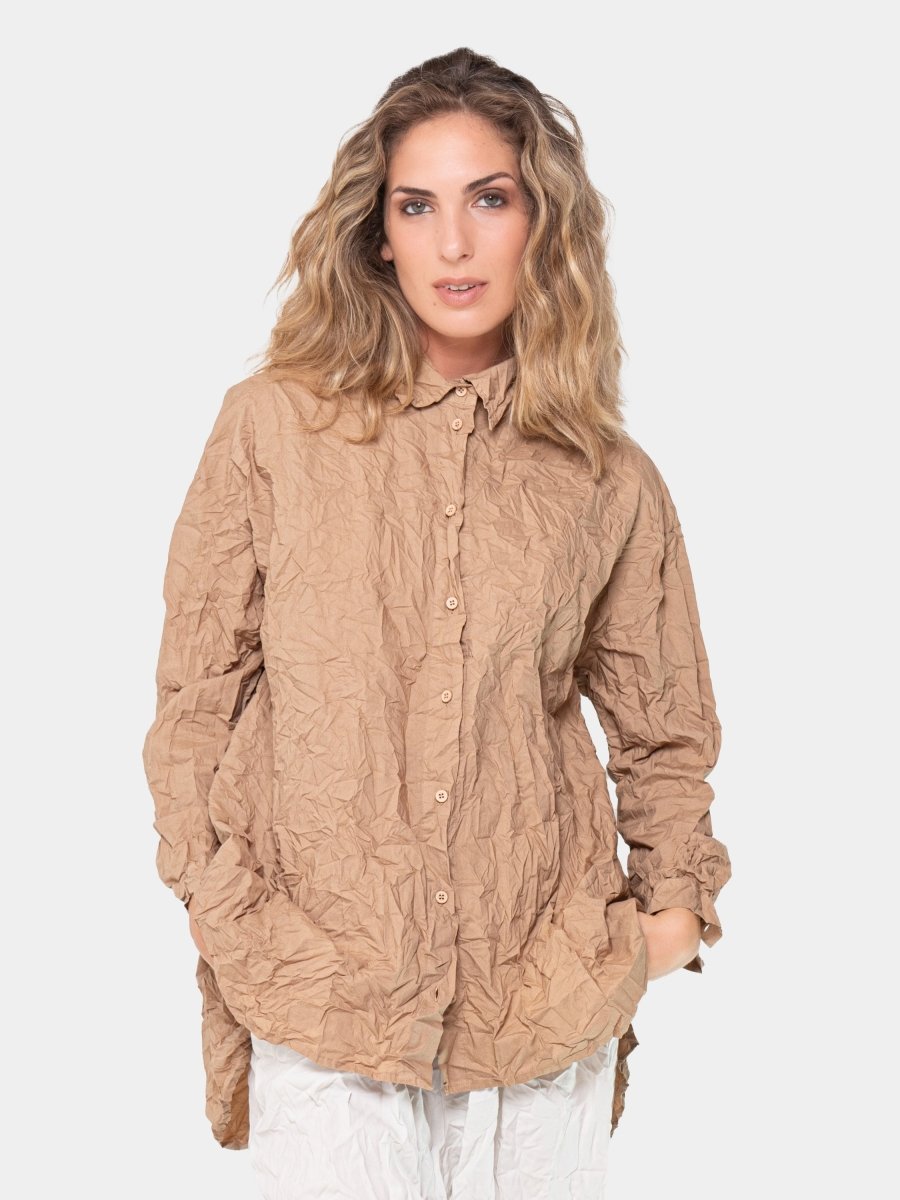 The classic button-down shirt is complemented by a crinkled finish, giving it a laid-back, lived-in look that's perfect for casual days or layered for a more polished ensemble. Whether tucked in or worn loose, this shirt will keep you looking chic and feeling at ease all day long.