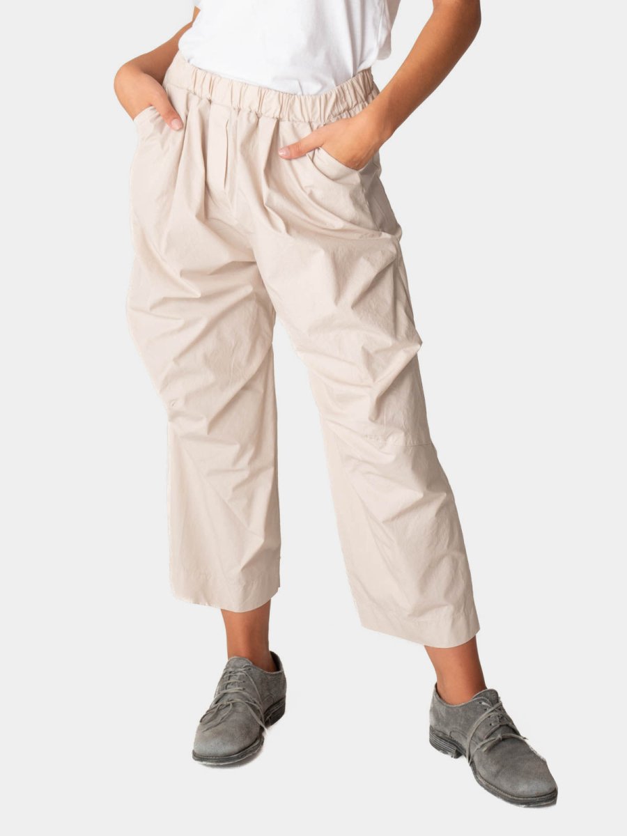 Wear comfort without sacrificing style with our Elastic Waist Straight Leg Cotton Pants, a garment that elegantly accompanies you throughout the day. Crafted entirely from precisely woven cotton, these pants are a fusion of impeccable craftsmanship and functionality, providing a sensation of softness and breathability. The elastic waist ensures not only a comfortable and snug fit but also maximum flexibility of movement. The strategically placed pinched cuts create refined volumes, adding an innovative touch to the design that our brand is devoted to. The presence of side pockets adds practicality without compromising elegance. These pants are the ideal choice for those seeking a perfect synergy between sophistication and comfort, making every day an opportunity to express your personality through clothing.