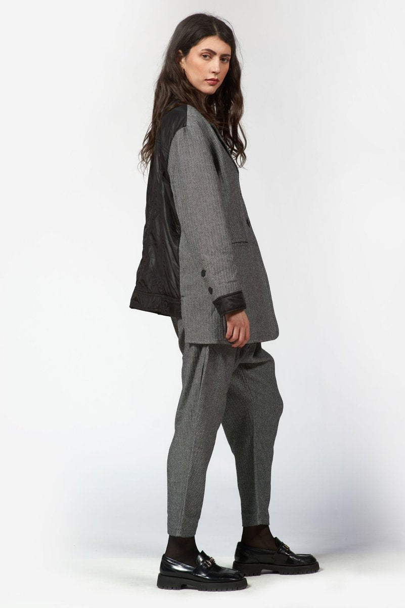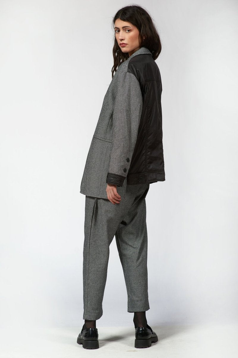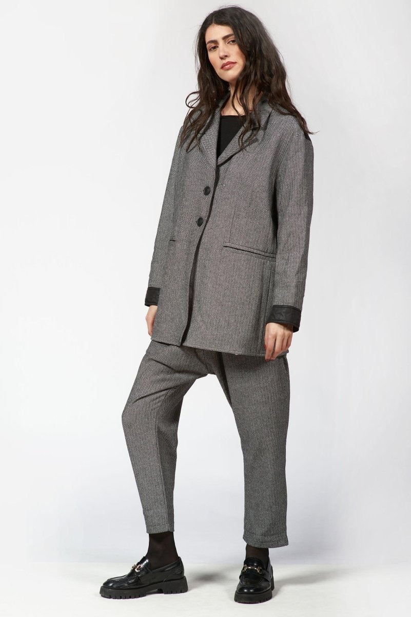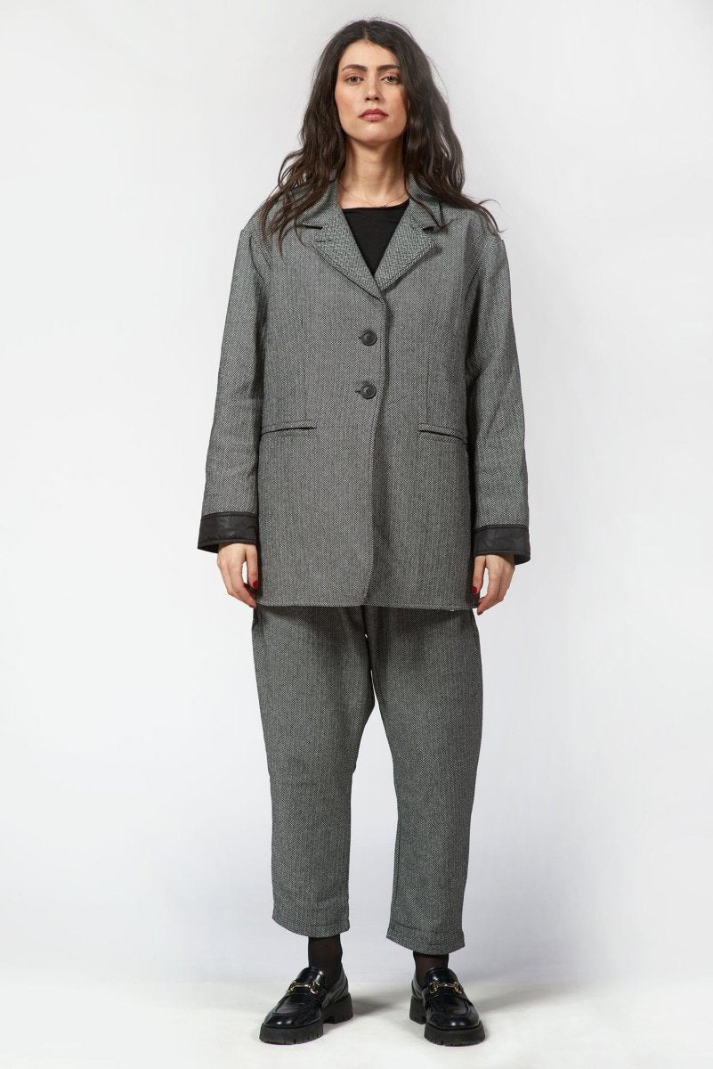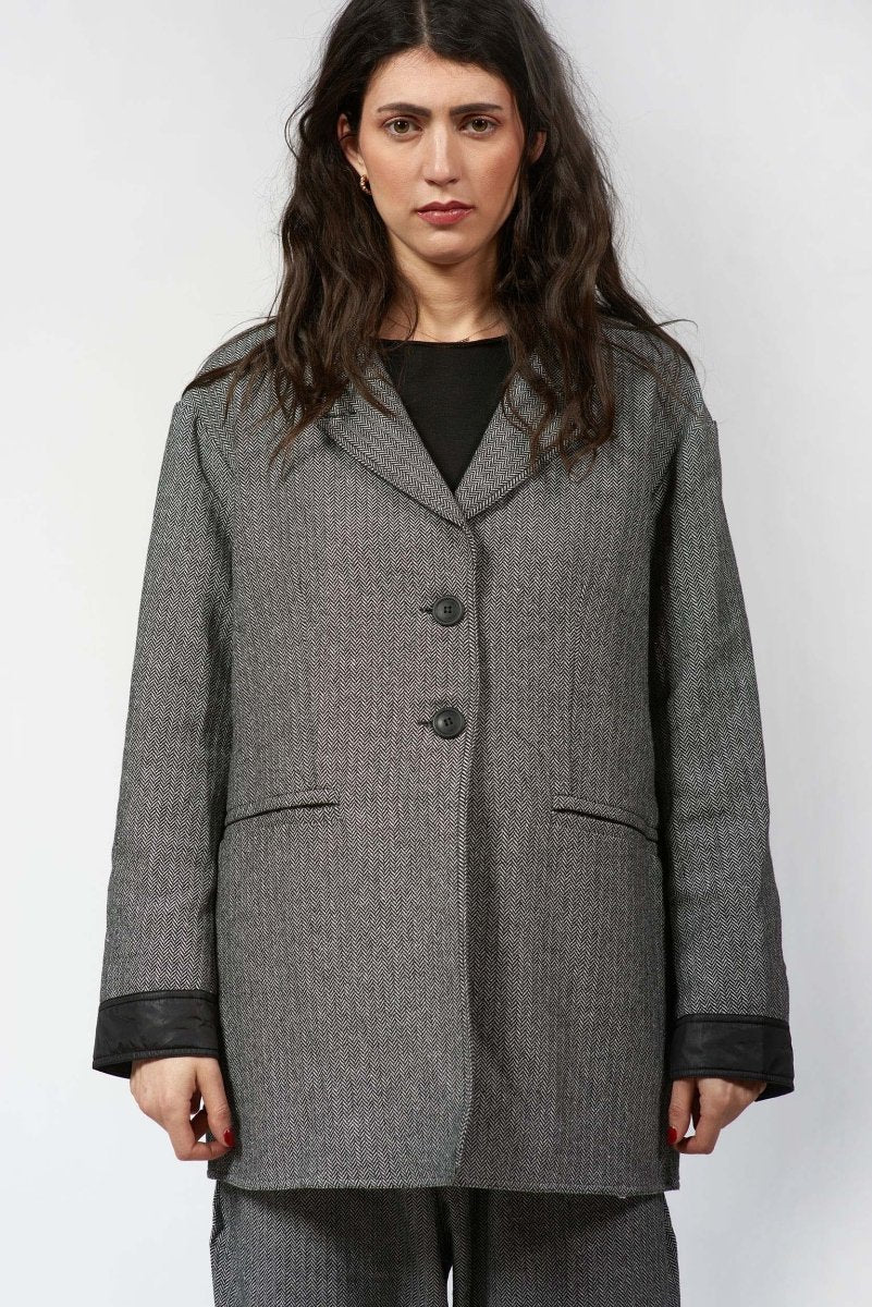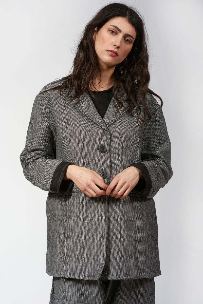 Polished yet effortlessly wearable, this men-style Jacket is a modern take on classic tailoring. Crafted from a structured woven fabric with a timeless herringbone pattern. The notched collar and two-button front closure bring traditional tailoring details, while the subtle contrast trim at the cuffs adds a contemporary edge.