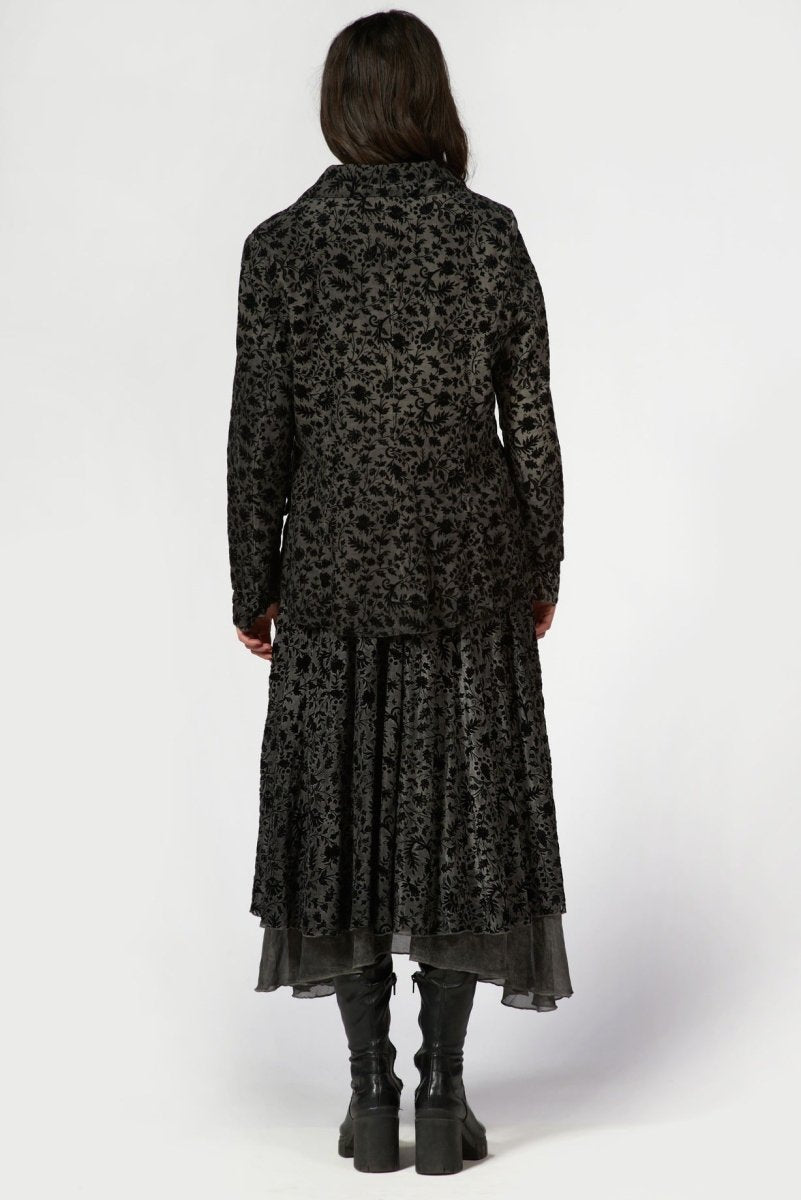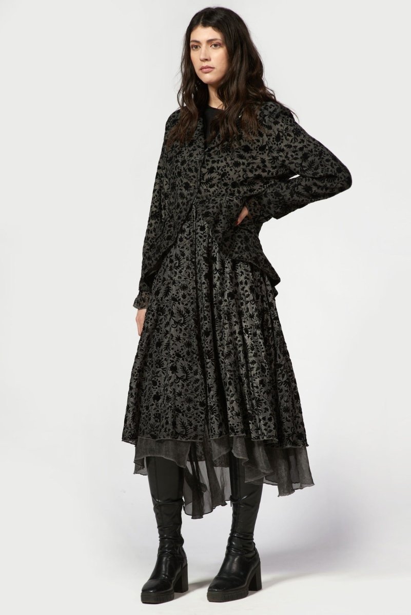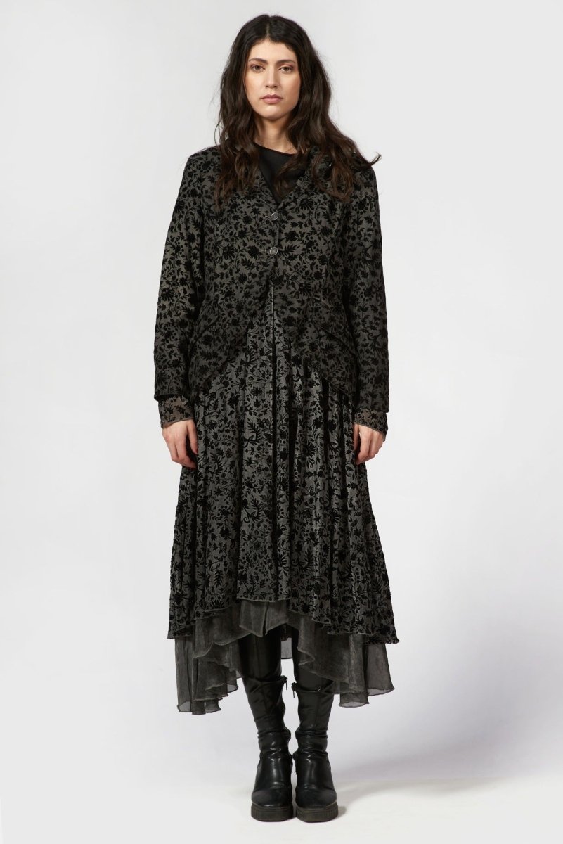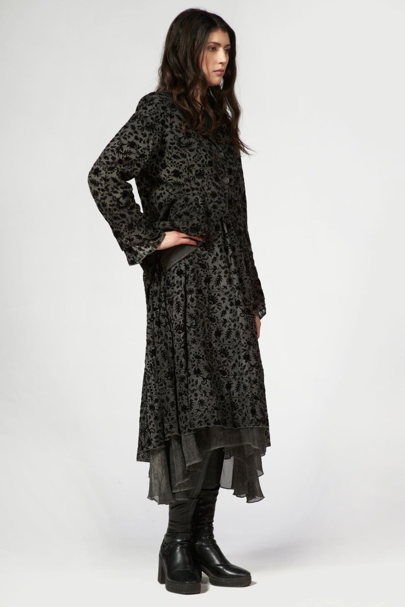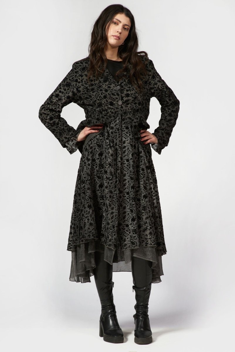 This Flocked Blazer Dress is a holiday statement piece. . Crafted from lightweight sheer fabric, this dress features an intricate velvet-style floral burnout pattern layered over a soft underlay for depth and dimension. The relaxed collared neckline and button-front closure add a tailored touch, while the long sheer sleeves create an elegant, airy feel.
