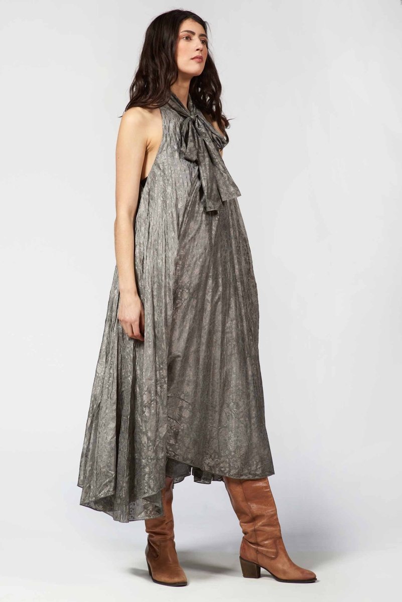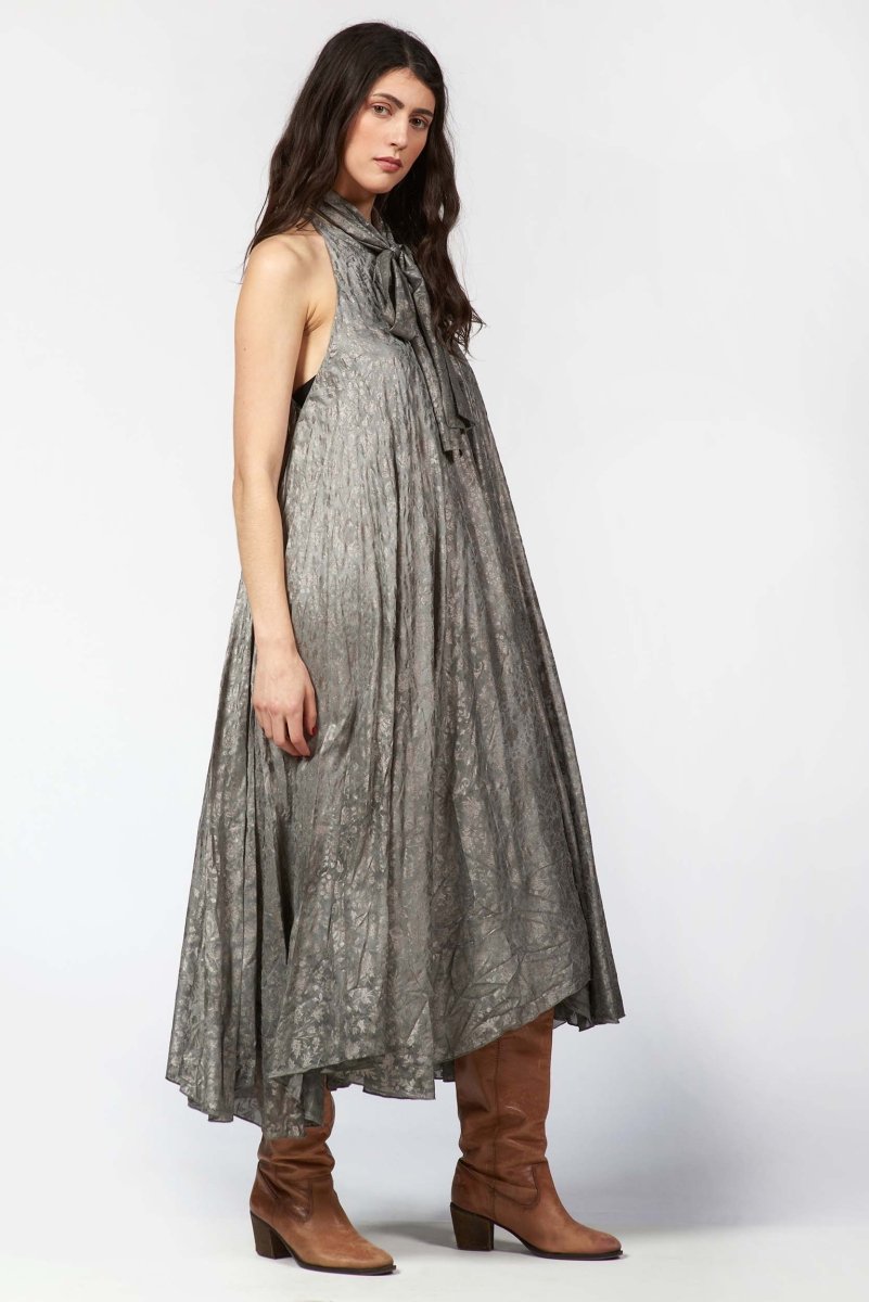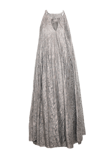 A statement in sculptural elegance, this laminated halter-neck dress shimmers with a refined silver print that catches the light from every angle. The fluid silhouette drapes with effortless precision, creating a striking balance between modern edge and evening sophistication. Finished with a clean, high-gloss texture, it transforms any moment into an occasion.