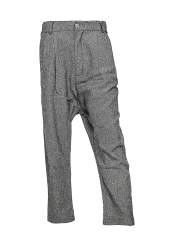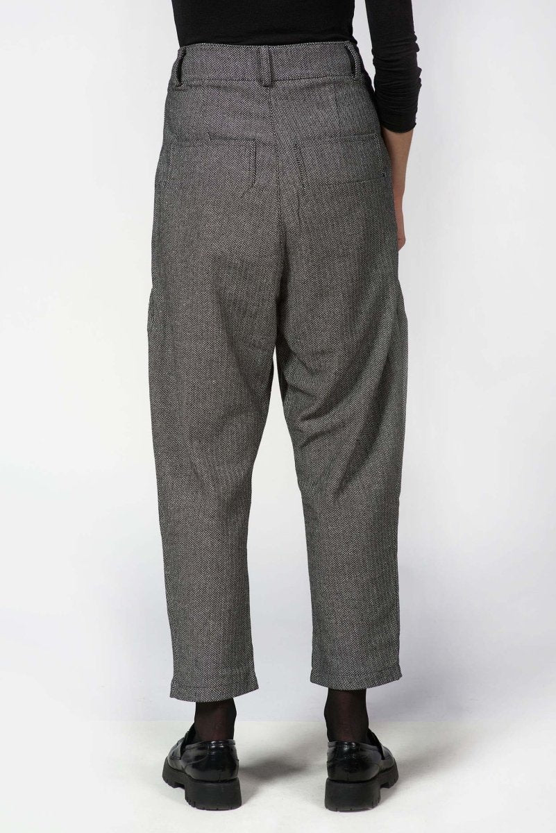 Thoughtful tailoring details, including front pleats and a clean waistband that adds sophistication while allowing ease of movement. Crafted from a structured woven fabric with a subtle herringbone texture, they feature a mid-to-high rise waist and a relaxed fit through the hips that gently tapers toward the ankle for a contemporary finish.