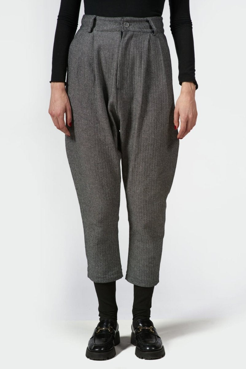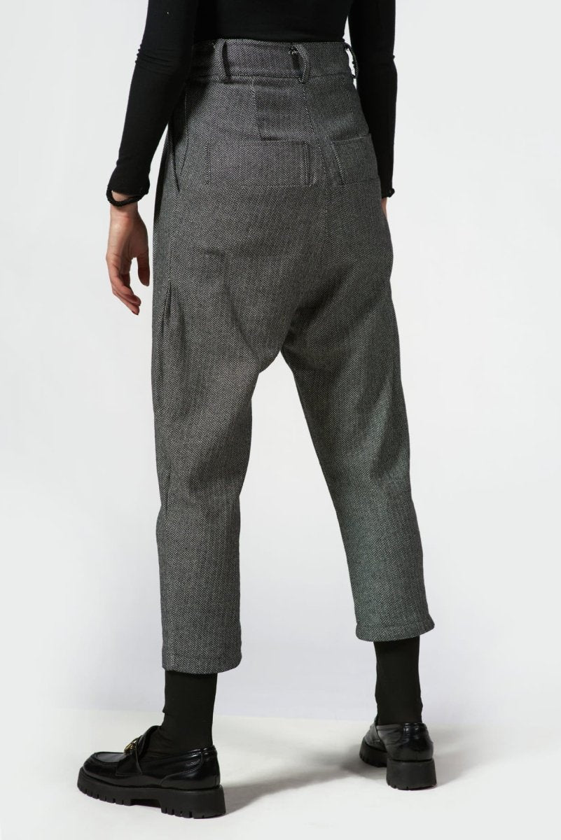 This Herringbone Pant is the perfect everyday essential look for work. The high-rise waist is finished with a button closure and belt loops, while front pleats create a flattering shape through the hips. The leg tapers gently toward the ankle, ending at a cropped length that pairs perfectly with boots, loafers, or heels.