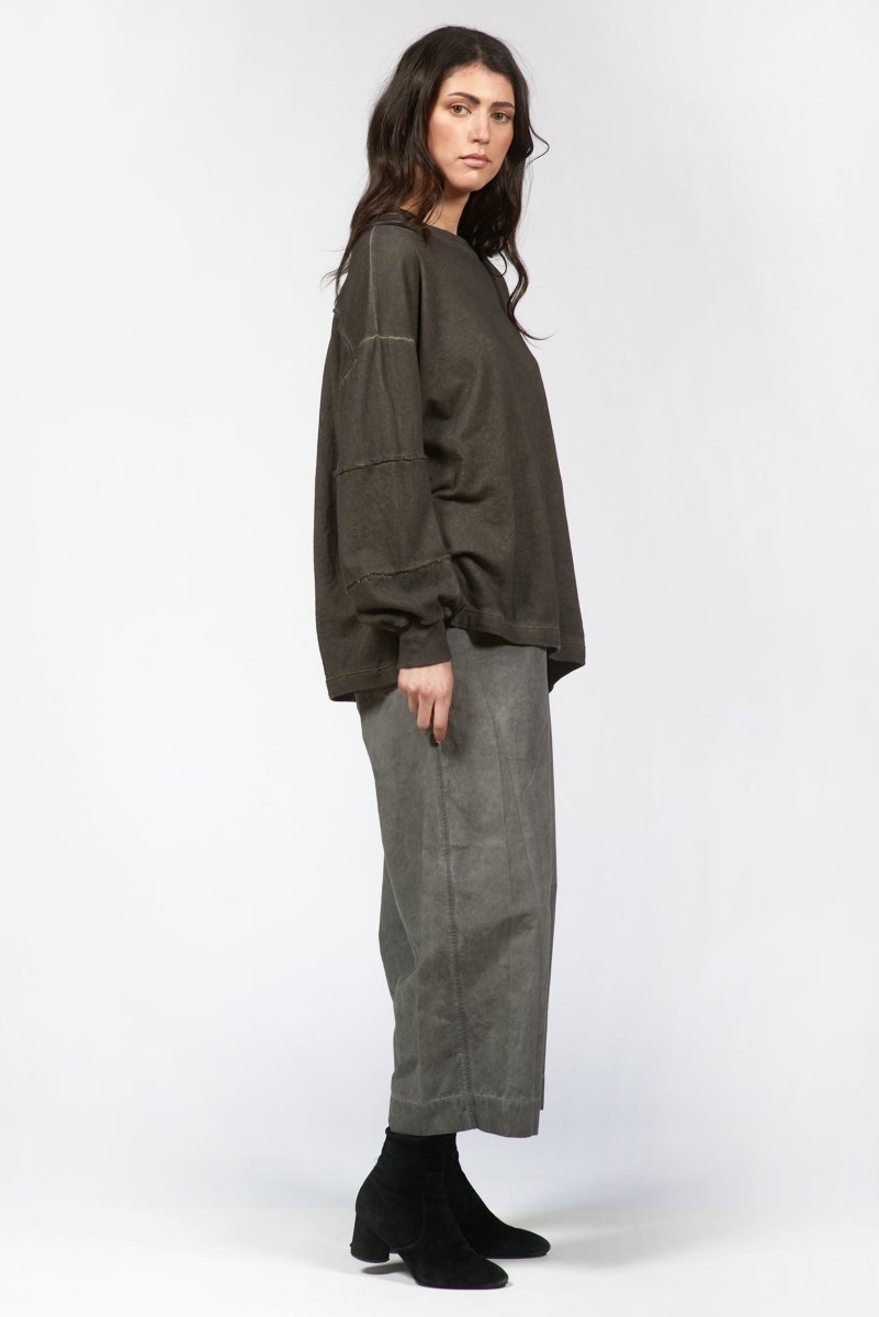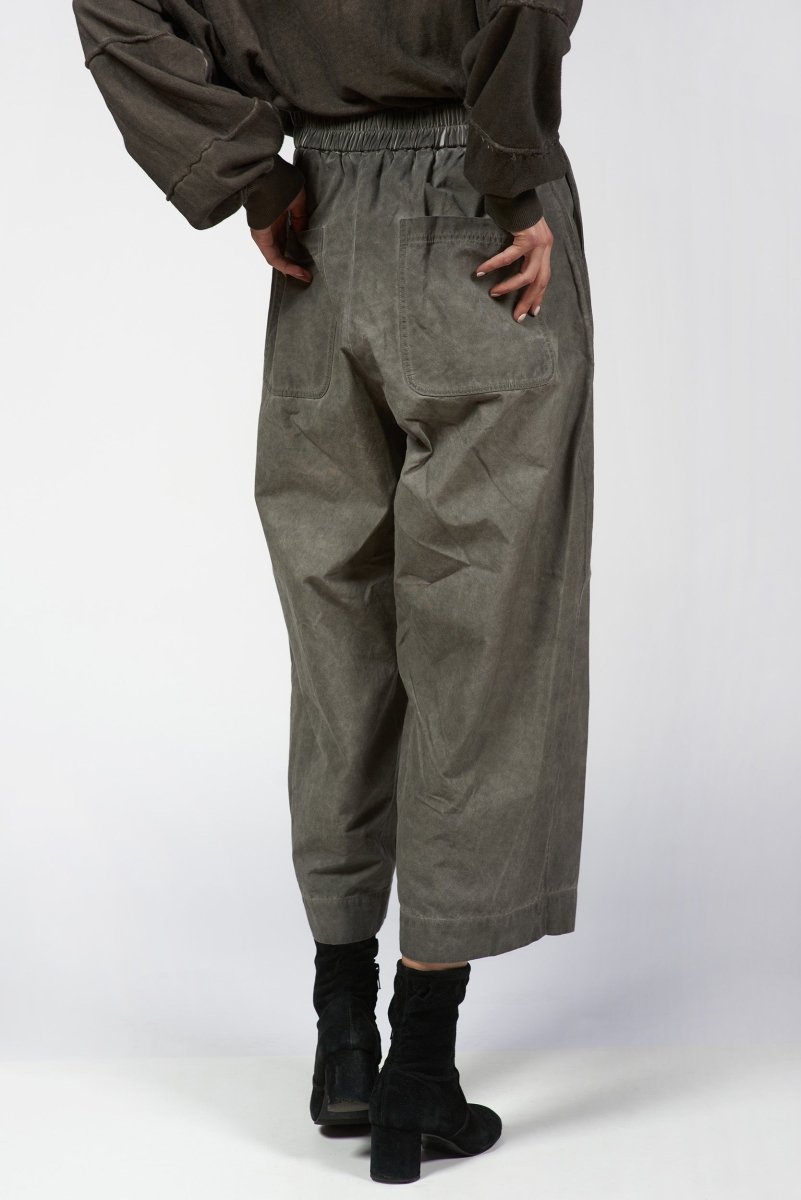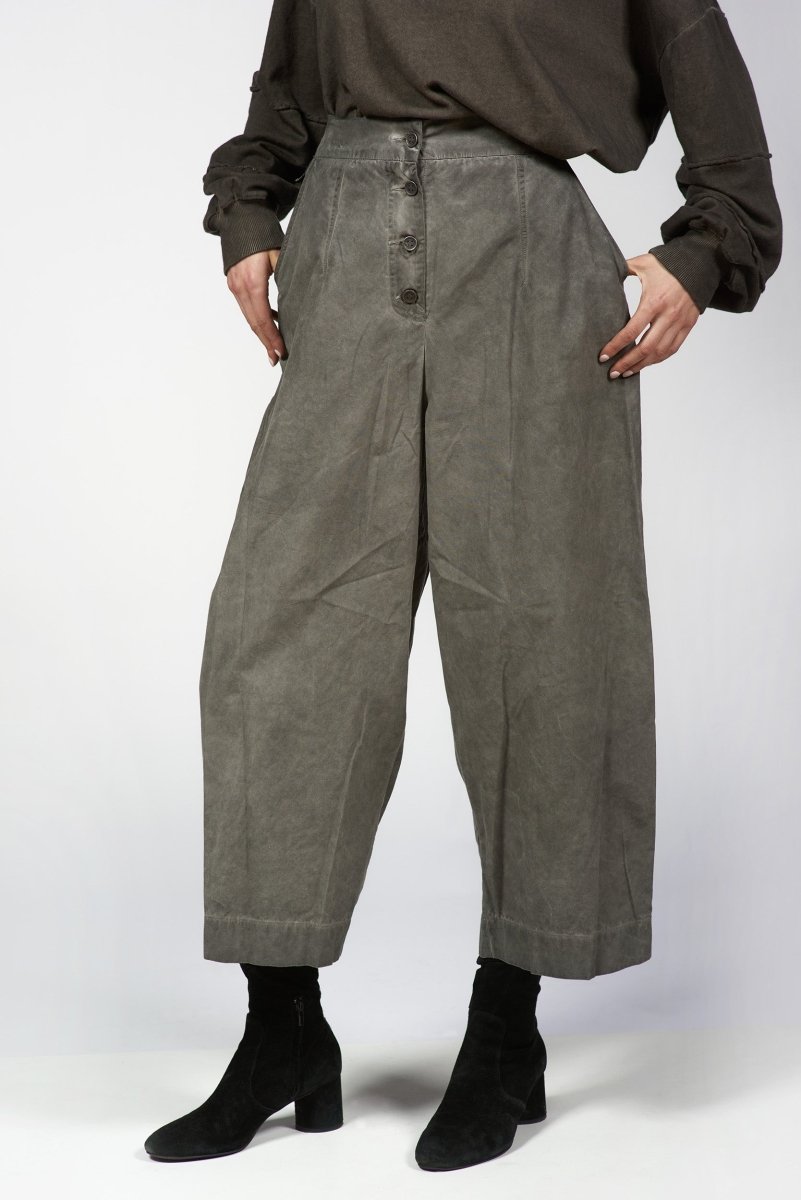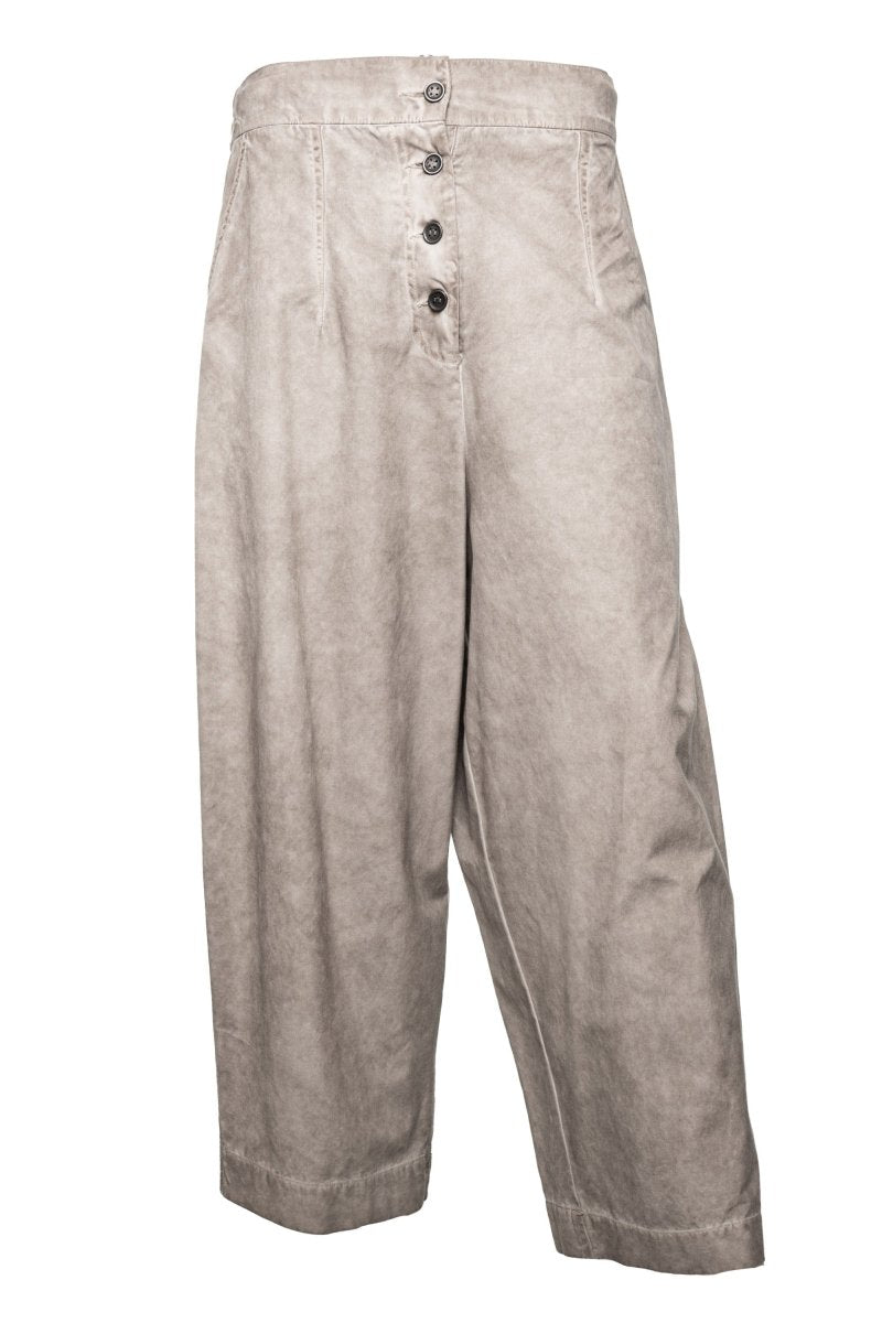 Step into these wide-leg cut, stonewashed fabric with gently worn-in finish pants. Designed with a flattering high-rise silhouette, the structured waistband is accented by a vertical row of four tonal buttons that add subtle detail and secure closure.