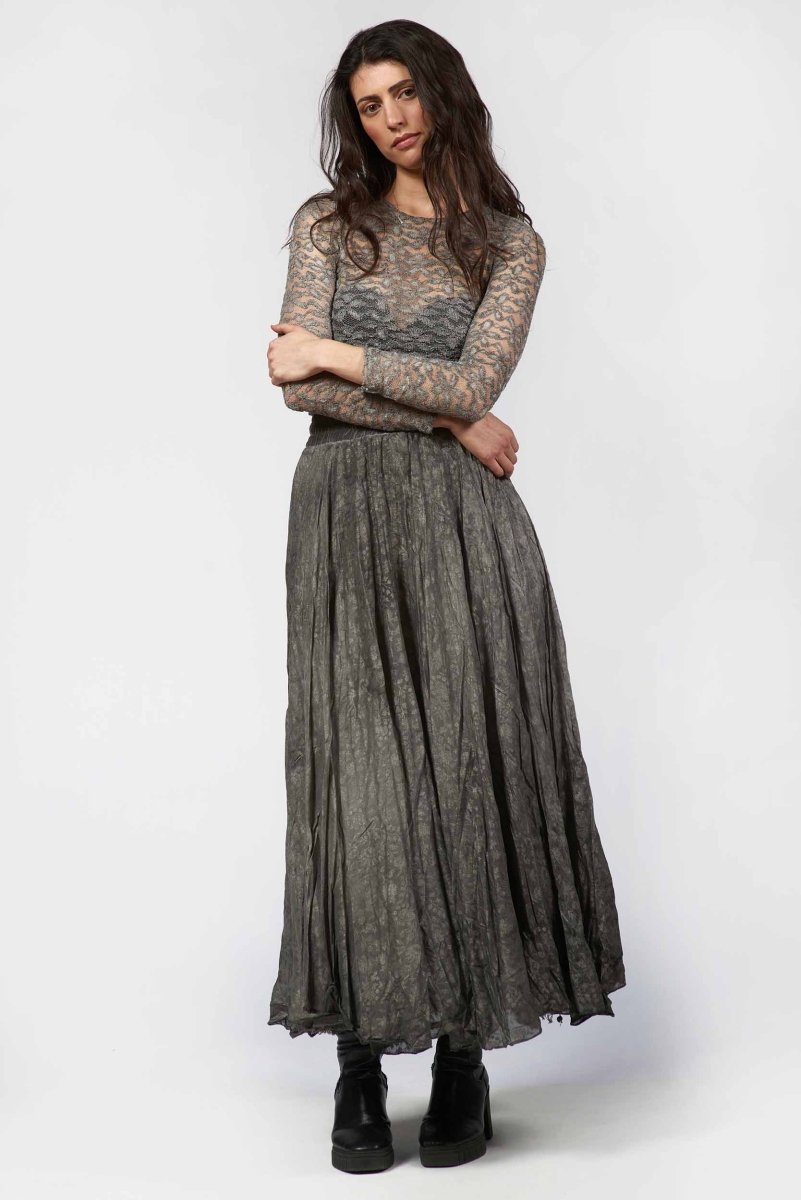 Crafted with a high-shine laminated finish, this circle skirt features a reflective silver print that brings depth and dimension. The structured drape offers a polished, sculptural look while maintaining easy, graceful motion.