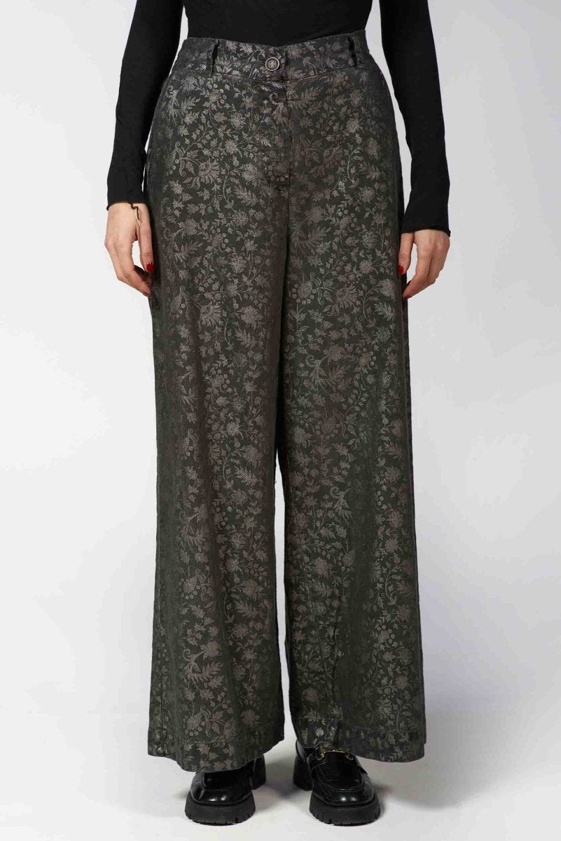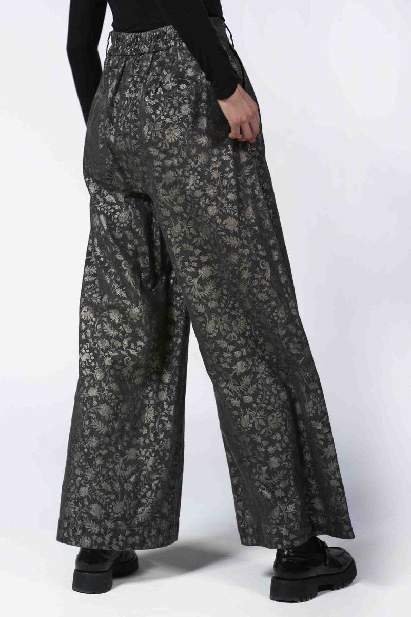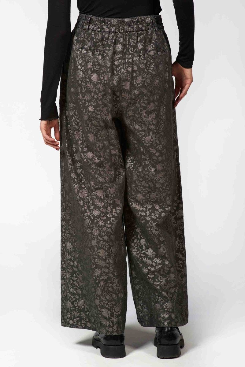 A fluid, wide-cut silhouette is elevated by a sleek laminated finish that reflects light with subtle dimension. The metallic surface adds a modern, sculptural edge while maintaining effortless movement. A bold yet refined piece that instantly sharpens any look.