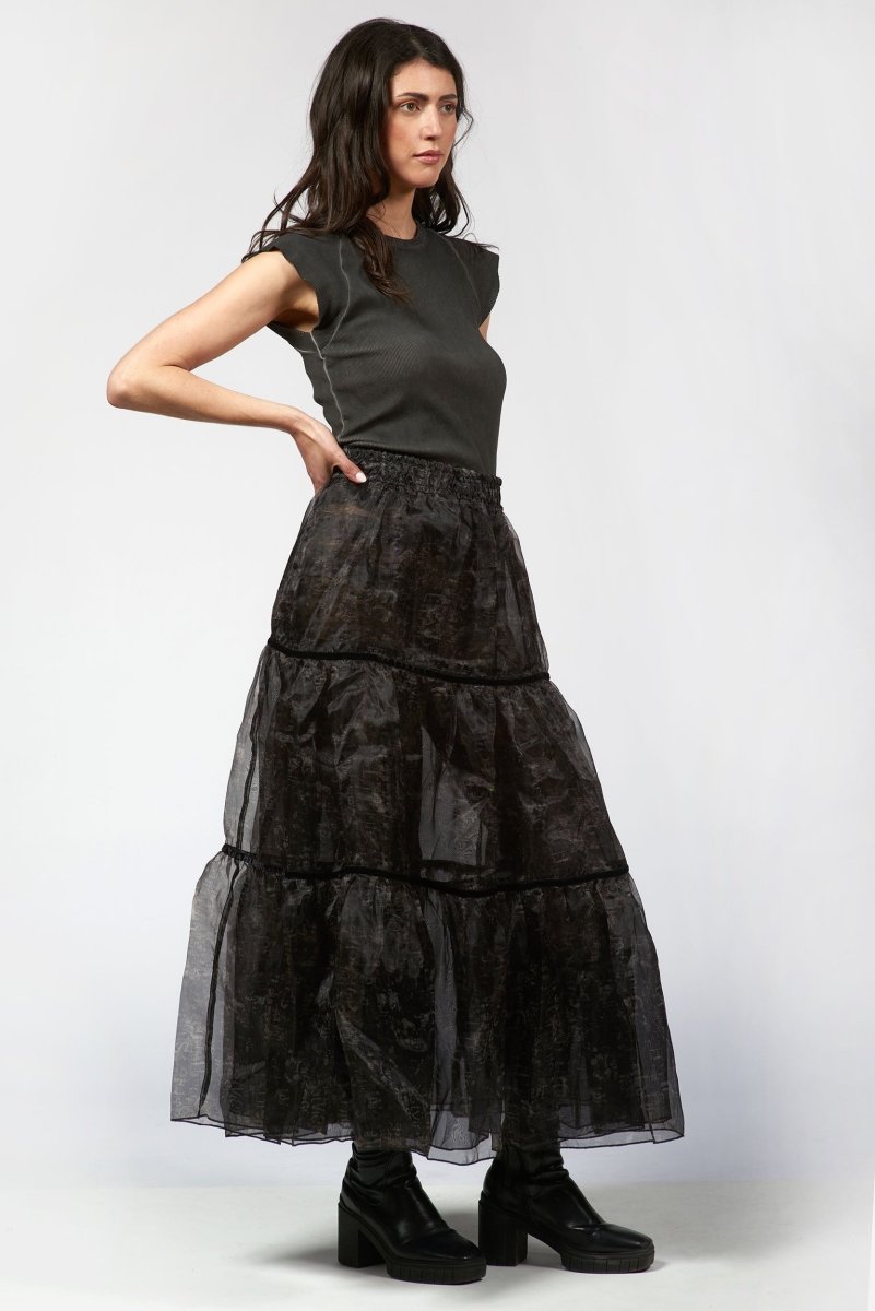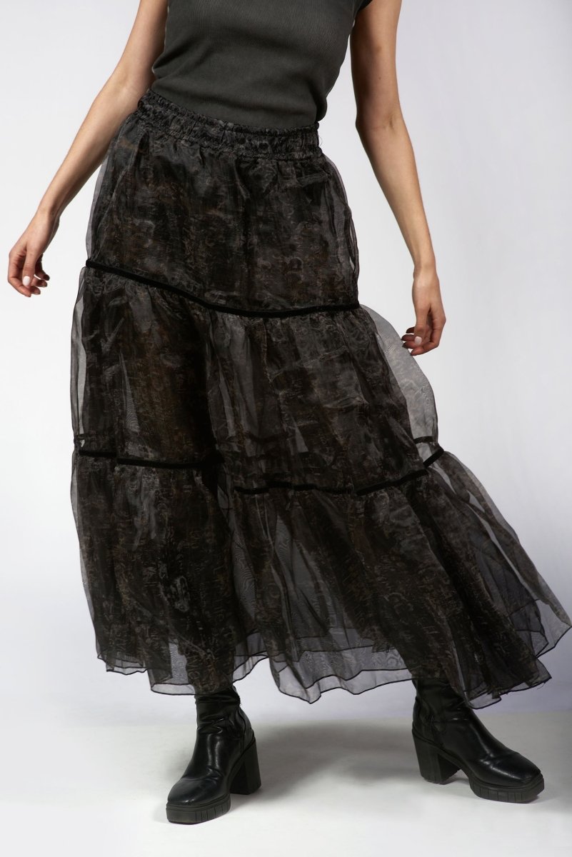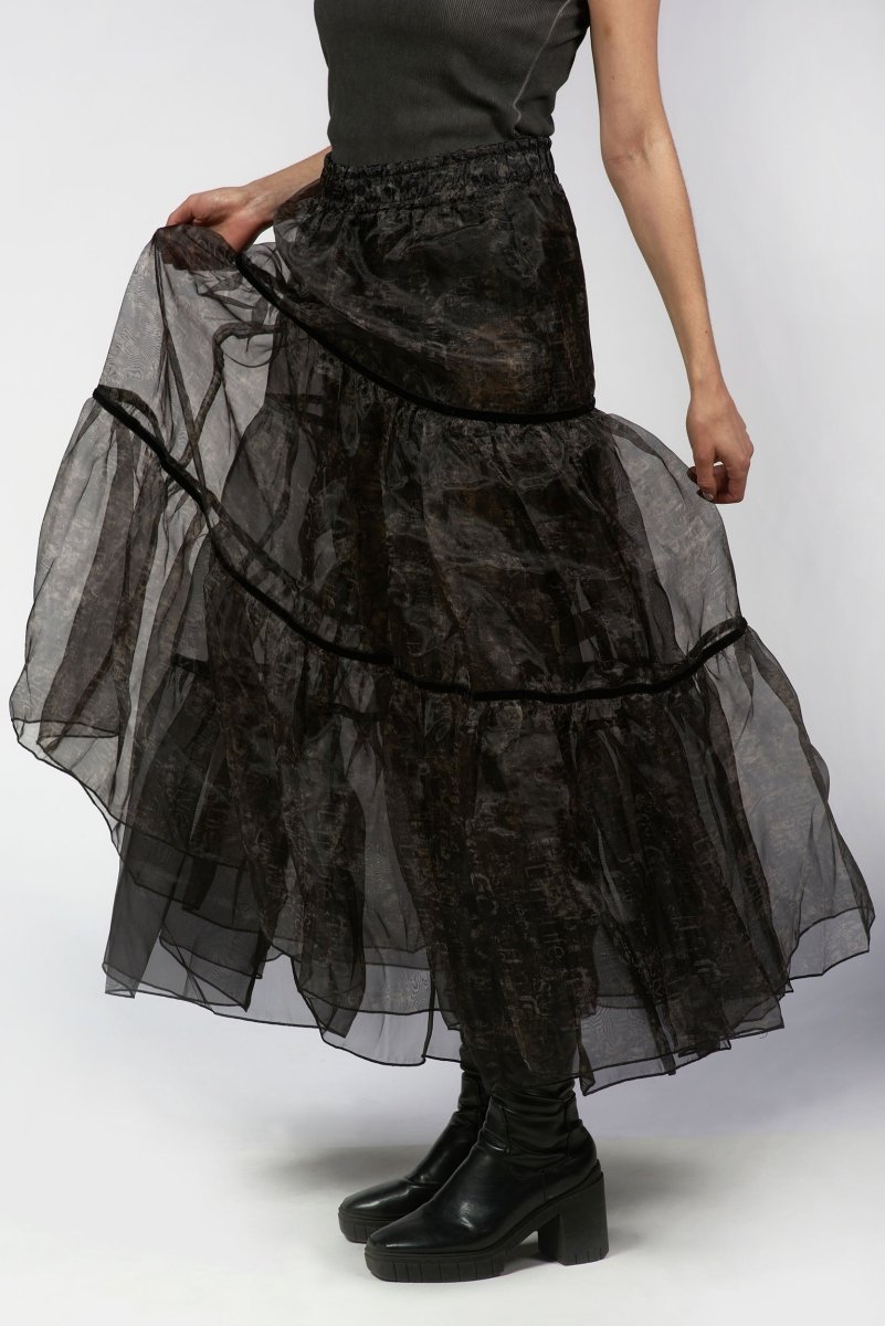 A total statement piece crafted from lightweight sheer organza with a delicate, semi-transparent finish, it features an all-over tonal abstract print for subtle texture and depth. The three-tier layered construction is defined by fine piping seams, creating soft volume and a flowing silhouette. Perfect for evening wear, vacation styling, or use as a layering piece.