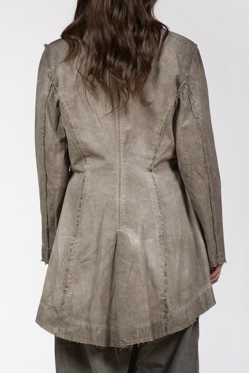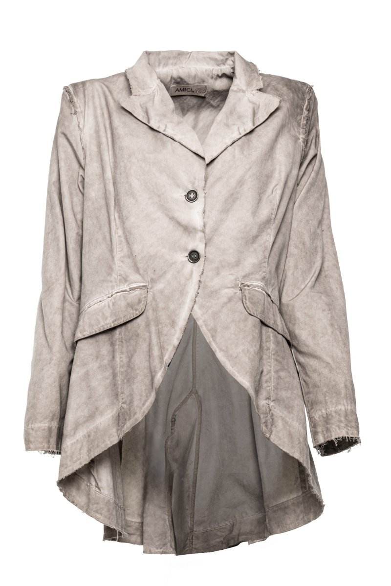 Turn heads in this jacket, which is constructed with a notched lapel collar, adding structure and sophistication to the neckline. A two-button front closure and dual flap pockets offer both function and form. Features a dramatic asymmetrical silhouette with a cropped front and elongated back hem for a modern twist on classic tailoring.