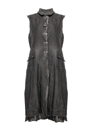Distressed beauty, tailored precision. Crafted from textured cotton with a vintage wash, this sleeveless dress features a high stand collar, flap hip pockets, and a layered hemline for subtle movement. A decorative brooch adds a personal touch, like jewelry stitched into memory.
