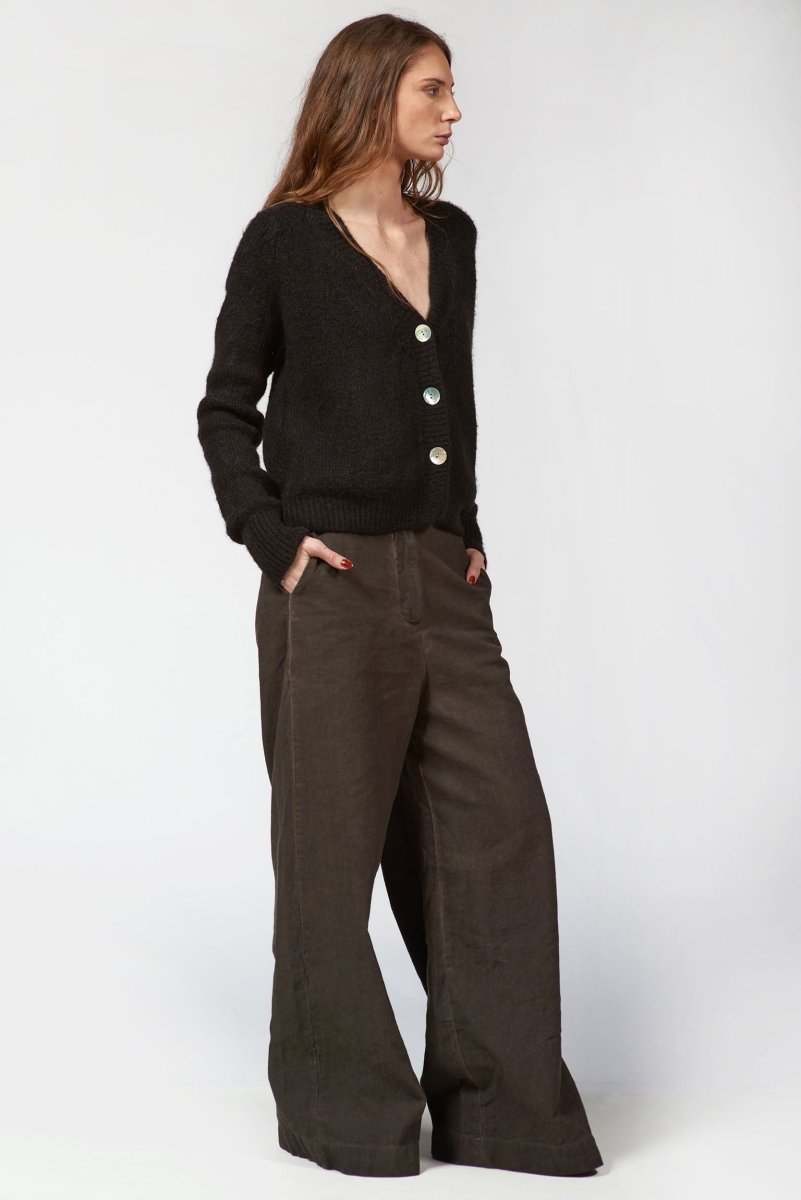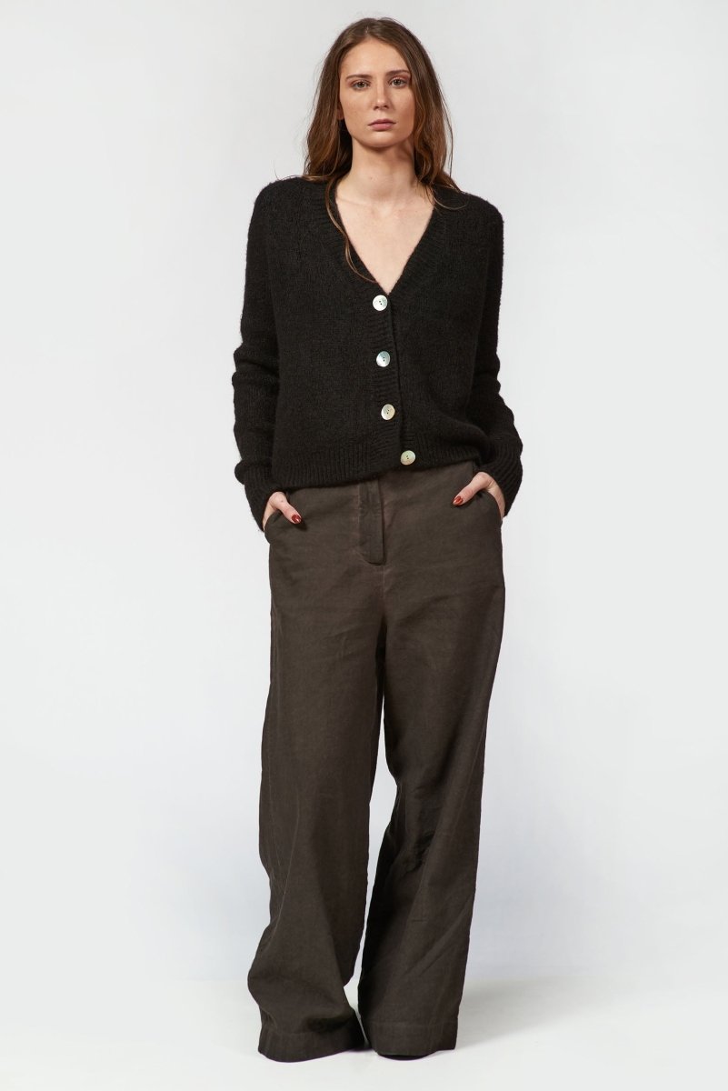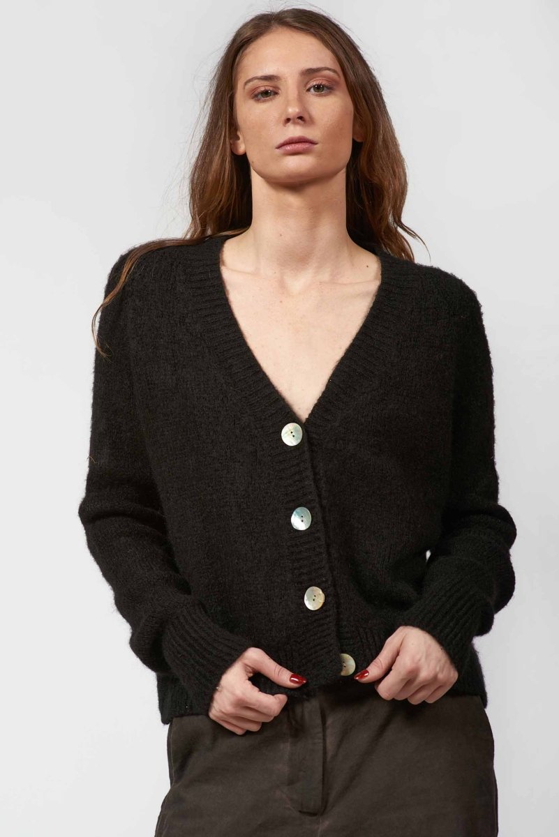 Keep warm without feeling heavy, in our 4-Button Cardigan. The deep V-neckline and oversized white buttons add a bold contrast, while the ribbed hem and cuffs bring subtle texture and a polished finish. Easy to pair with high-waisted jeans, skirts, or layered over dresses.