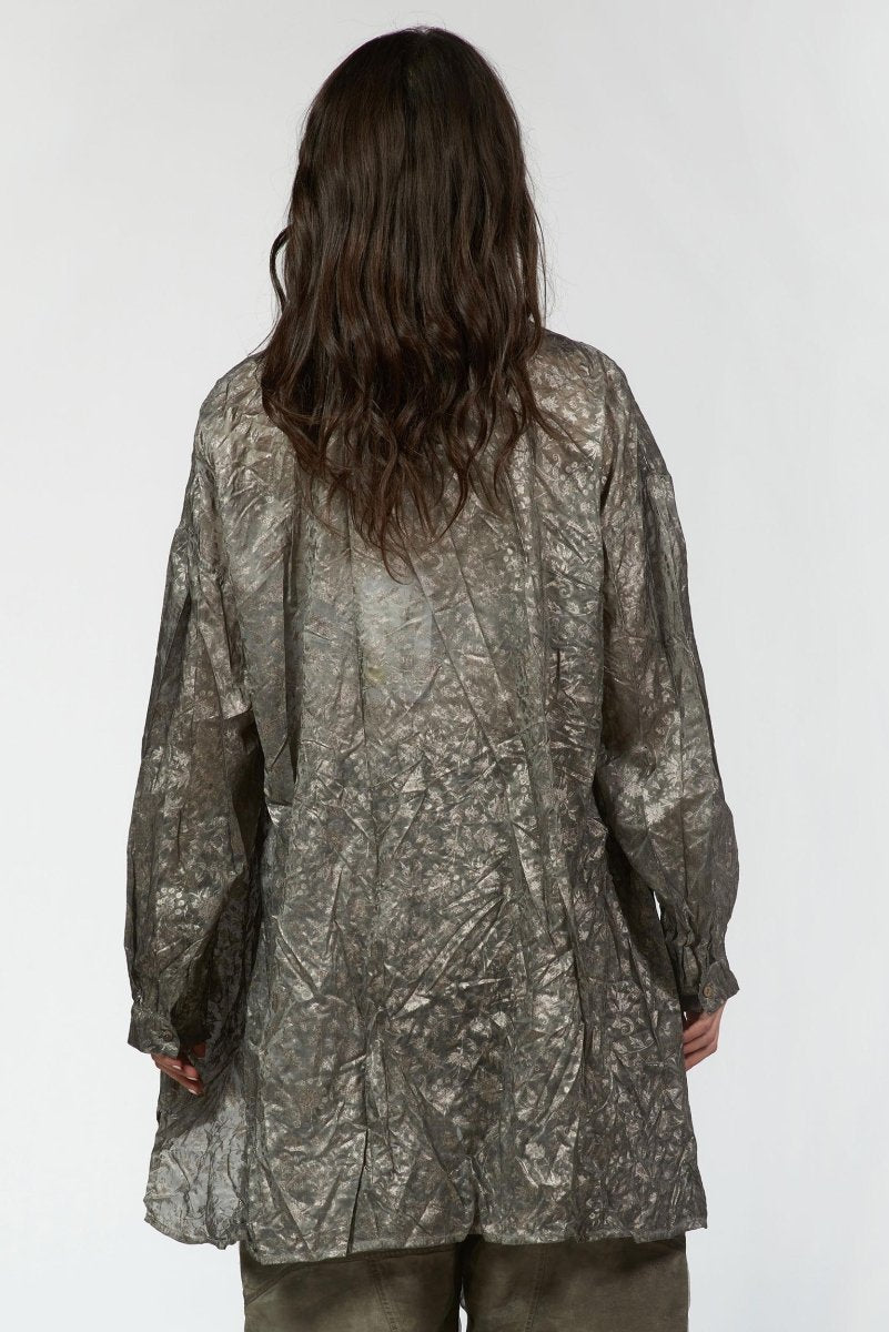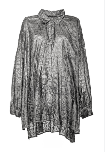 This oversized laminated shirt is defined by its luminous silver print, bringing a modern shine to a relaxed silhouette. The fluid drape and subtle gloss create an effortless balance of ease and refinement.