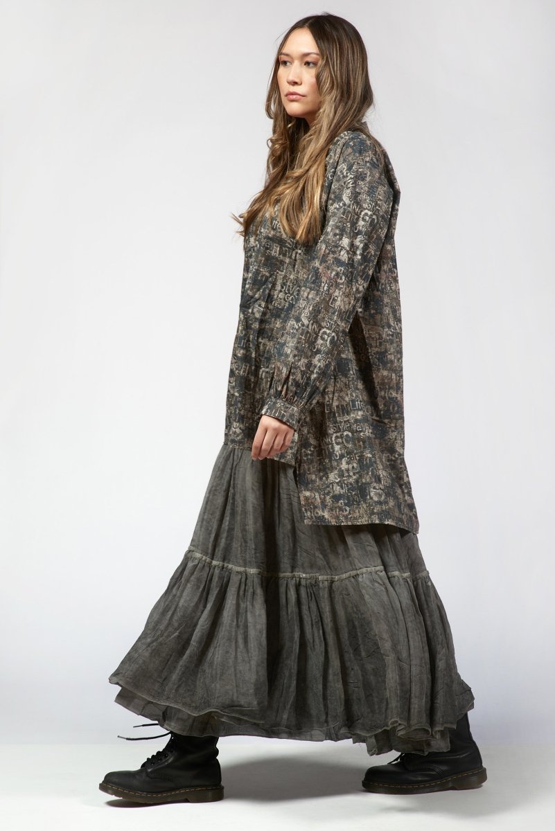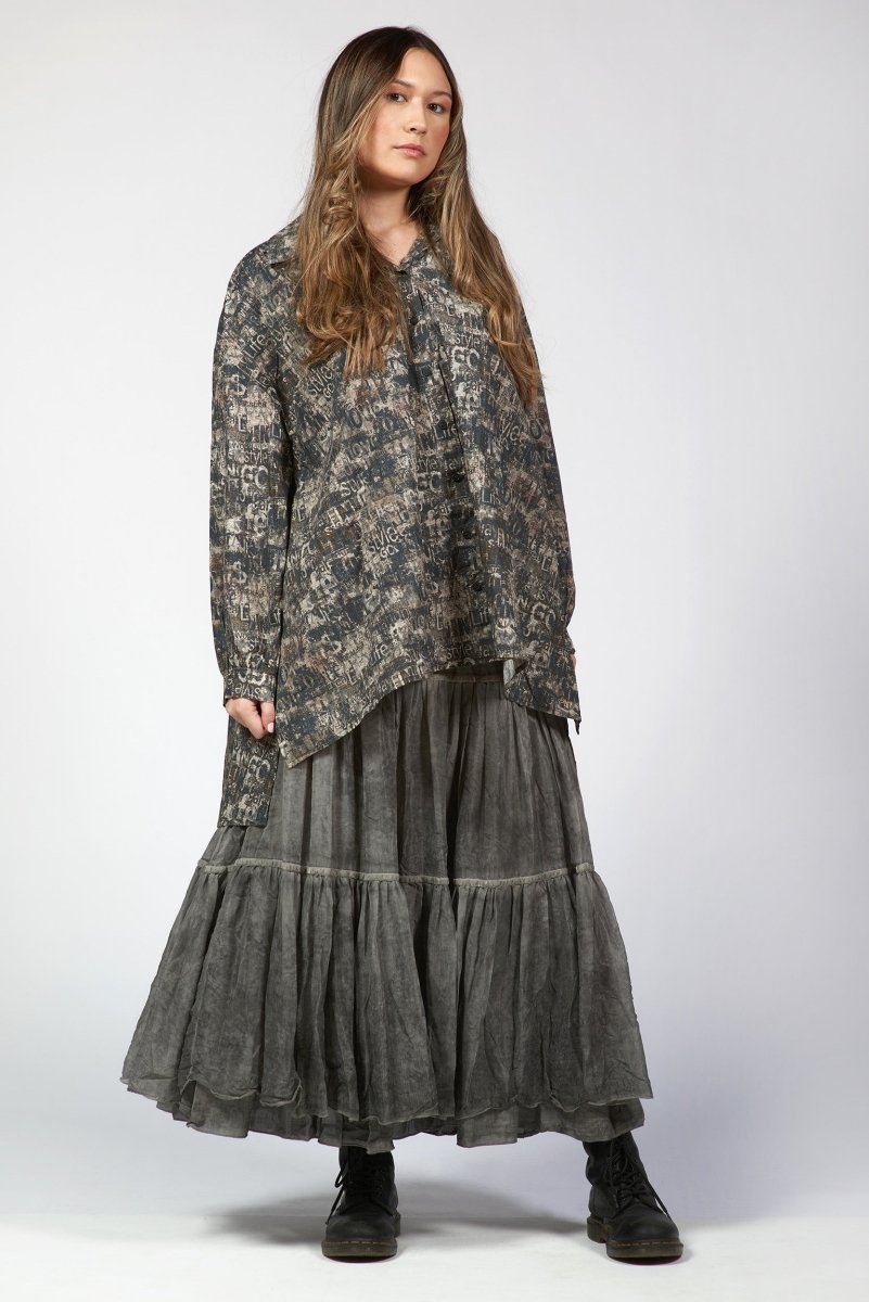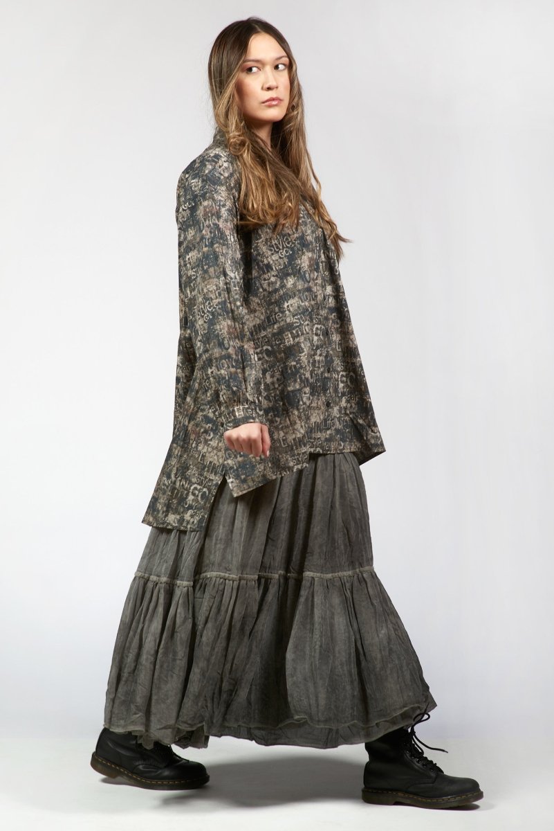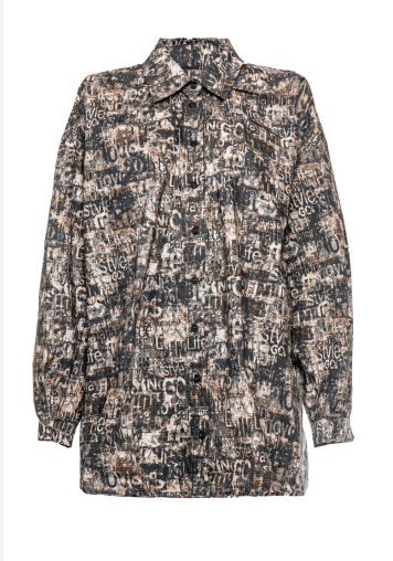 An effortlessly cool oversized silhouette crafted from lightweight cotton with a washed, all-over abstract text print. Dropped shoulders and a curved hem create relaxed movement, while button-front detailing and gathered cuffs add a touch of structure. Soft yet statement-making, it's that perfectly undone piece that feels like art you can wear. Pairs perfectly with flowing skirts or rugged boots for an off-duty, bohemian edge.