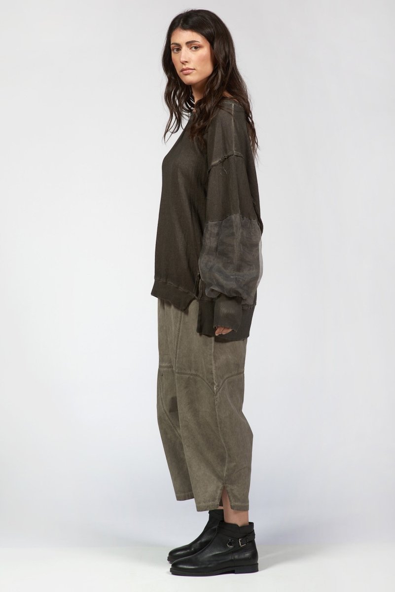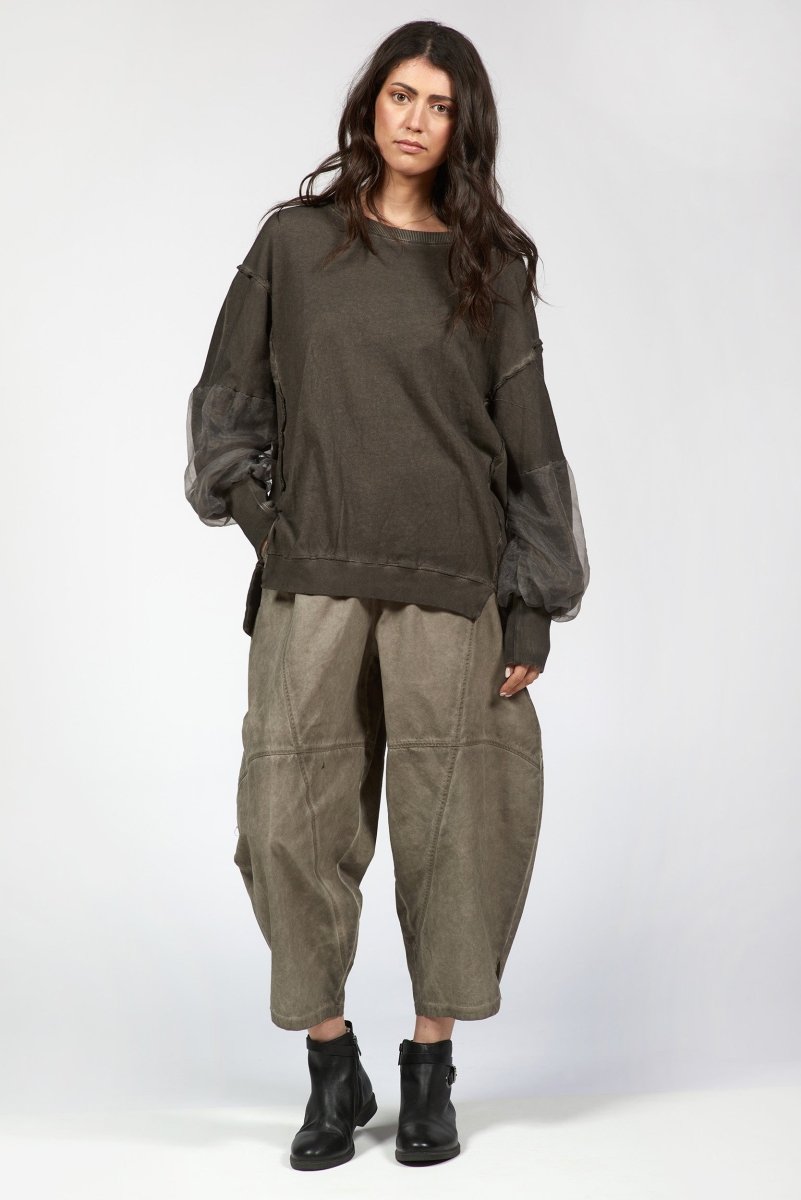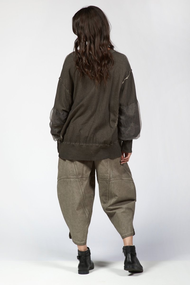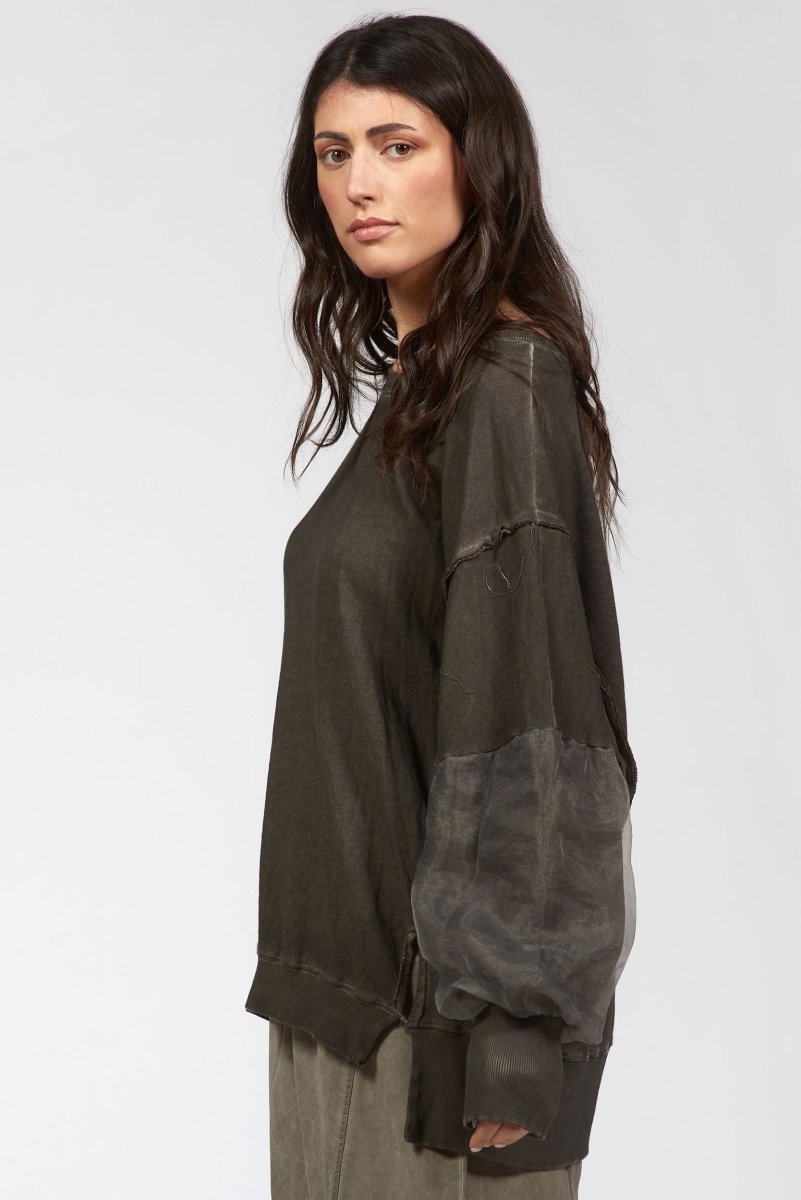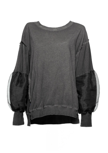 The sleeves steal the spotlight: voluminous balloon shapes made from sheer black fabric cascade from the elbows down. This sweatshirt is designed with a relaxed silhouette with a rounded neckline and asymmetrical hem that dips lower in the back offering ease, movement, and a hint of drama.