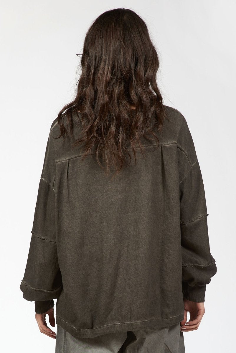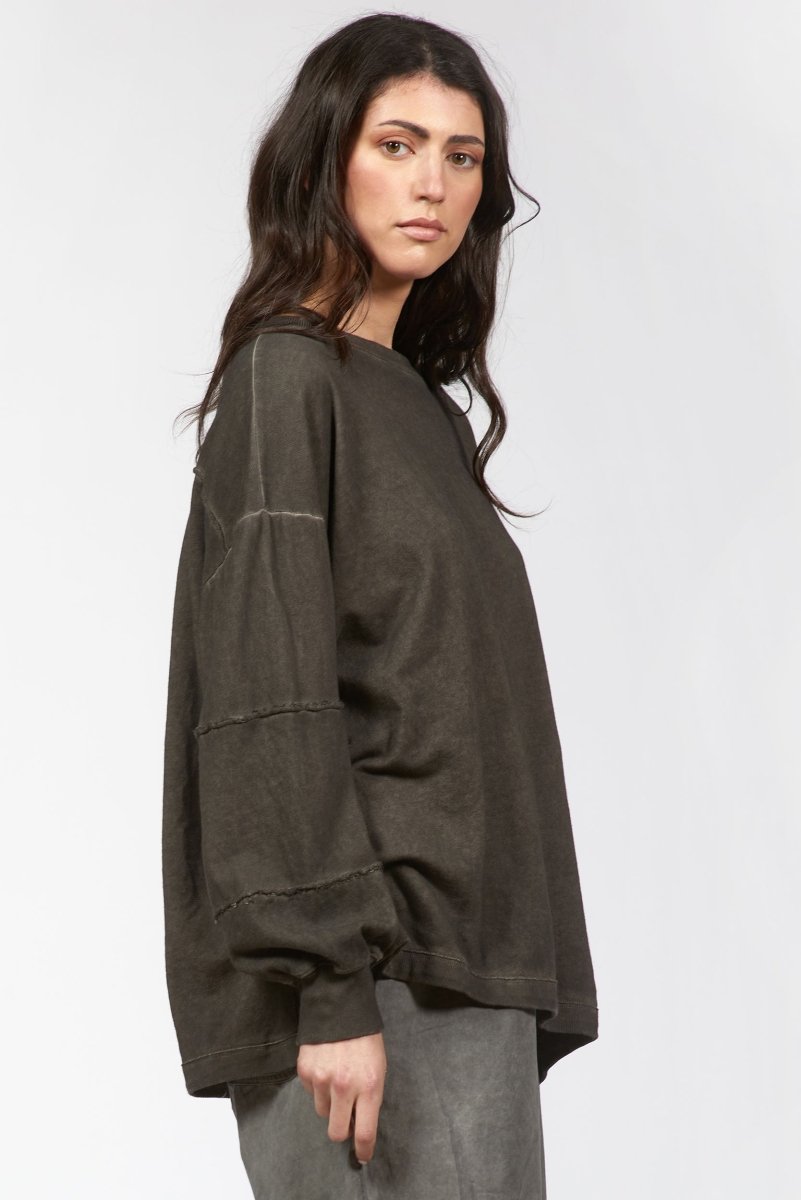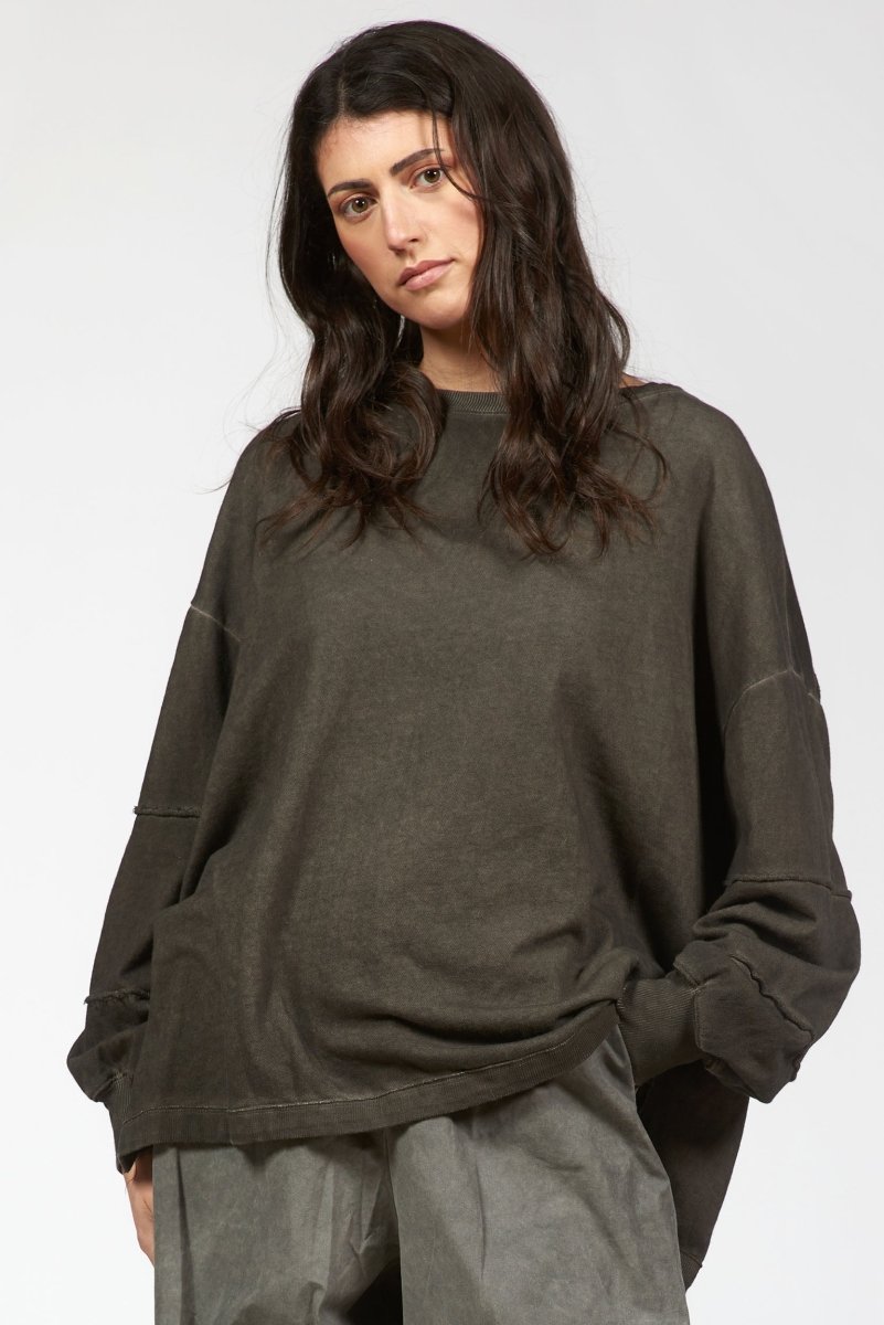 This sweatshirt is a study in softness and silhouette, crafted with billowy sleeves with horizontal seam accents for layered texture. While the voluminous sleeves and gathered cuffs add sculptural drama to an otherwise relaxed frame.
