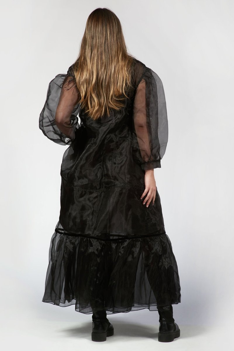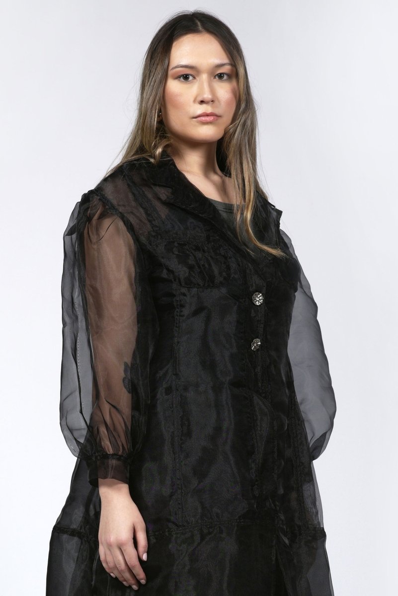 Turn heads this holiday with our Tunic with Ruffled Pockets. The perfect versatile piece that can be styled over a slip, bodysuit, or tailored trousers for a chic day-to-night look. rafted from luxurious sheer organza, it features voluminous balloon sleeves with gathered cuffs, a structured collar, and a soft A-line shape.