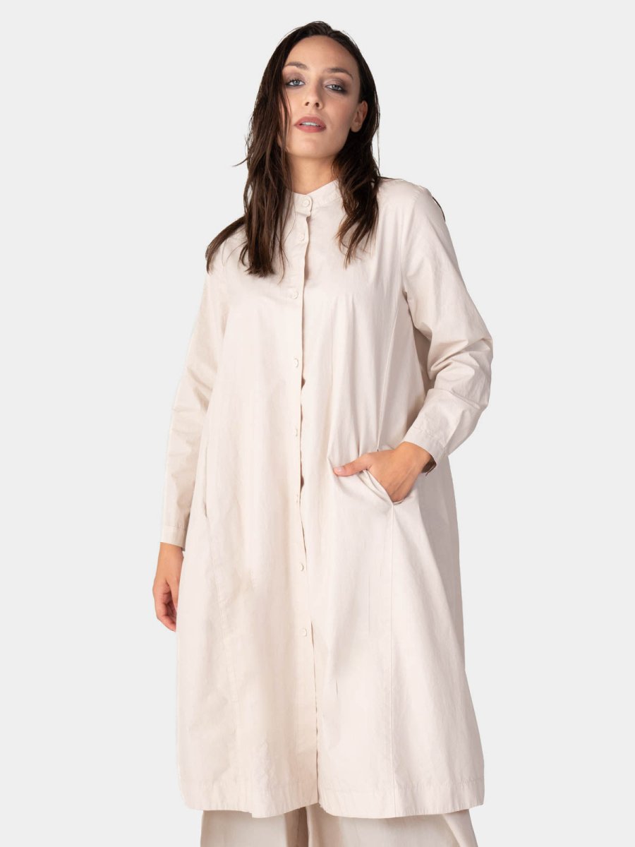 Crafted from 100% breathable cotton, our Long Sleeve Button-Up Shirt-Dress blends softness with timeless style. Featuring a mandarin collar and front buttons, it transitions effortlessly from casual to refined. Wear it solo with heels or layered over pants for a polished, versatile look.