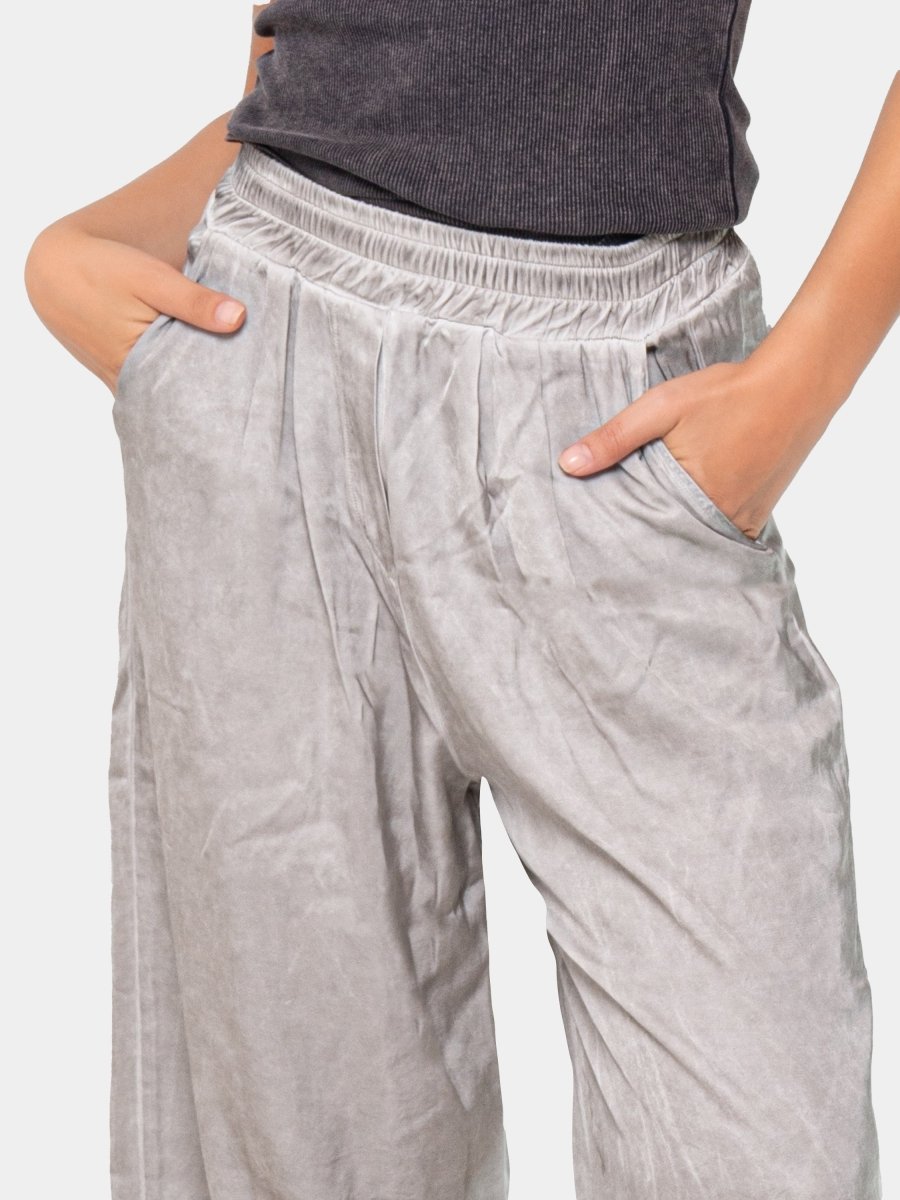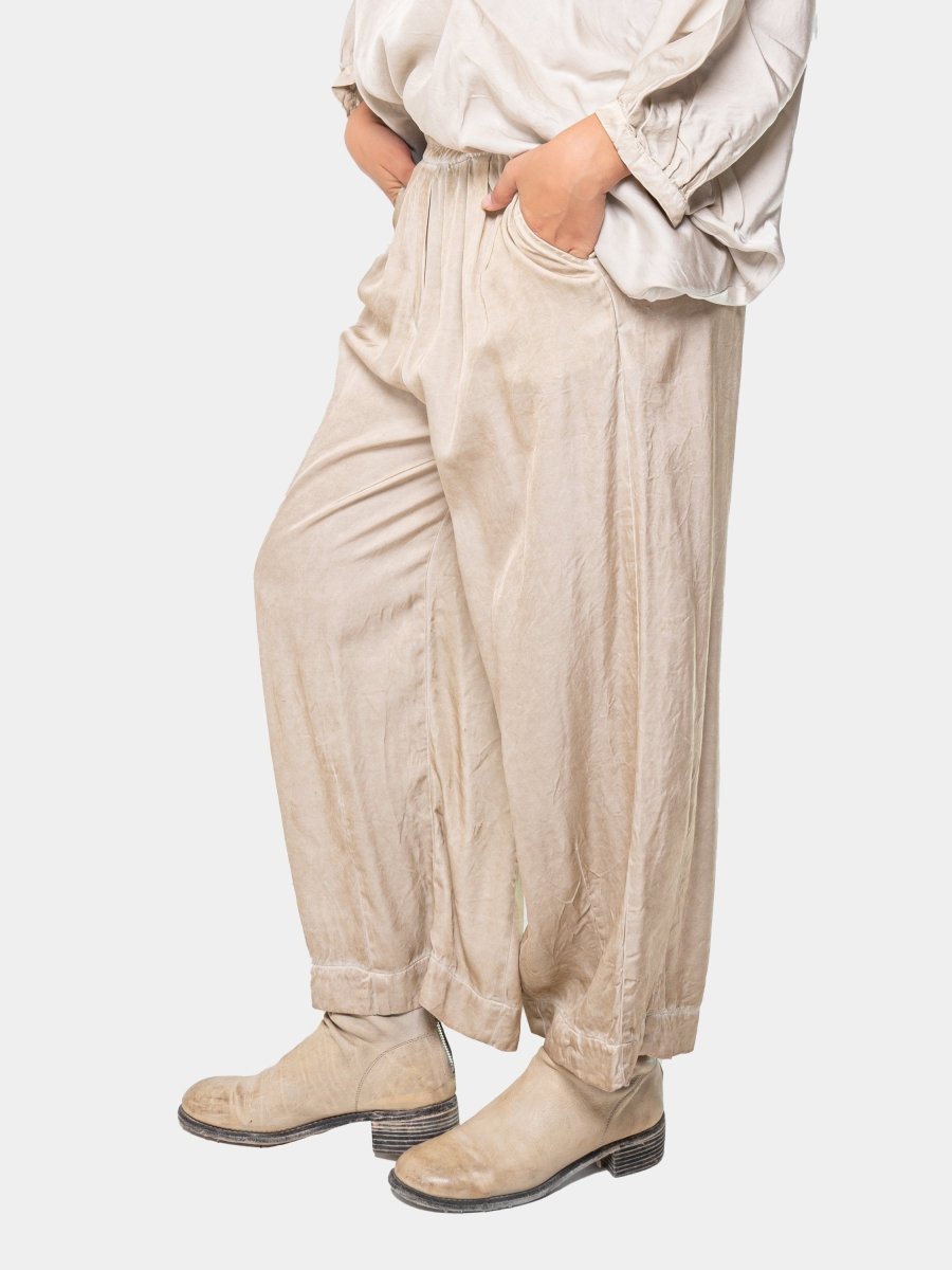 Featuring a relaxed fit, these trousers offer an easy balance of structure and softness. The elastic waistband and side pockets provide everyday comfort, while the darted hemline adds a quiet detail that shapes the silhouette. A versatile staple designed for layering, lounging, or living in.