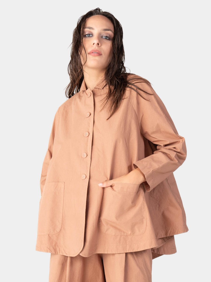 Lightweight cotton jacket with an A-line shape for comfortable layering. Features four front buttons and a single front patch pocket for added functionality. Designed for ease of movement and everyday wear.