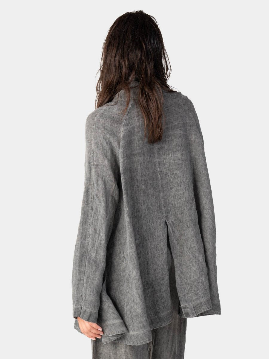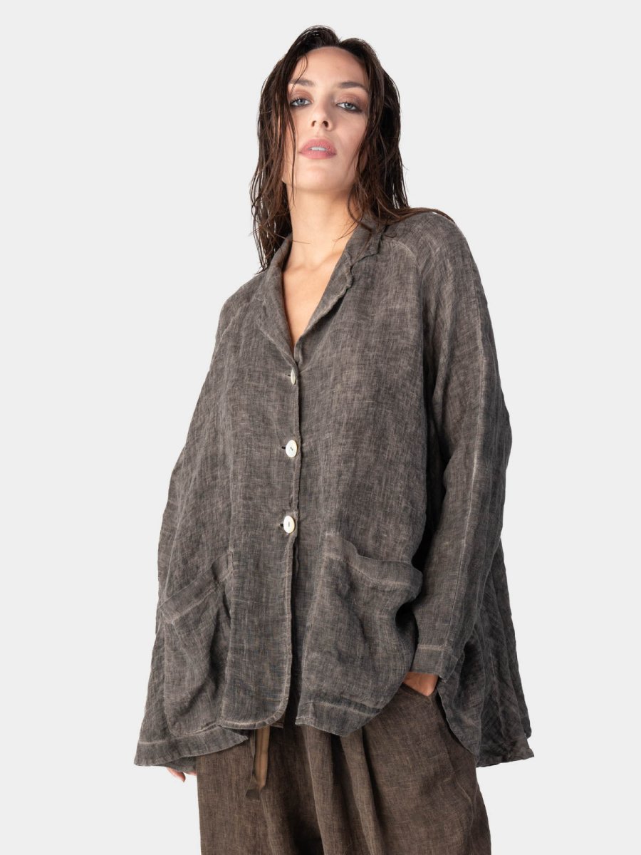 Stonewashed 100% linen blazer with a relaxed fit and soft texture. Features a notched lapel, large contrast buttons, and front pockets for functionality. Breathable and comfortable for all-day wear. The natural wash gives it a worn-in, vintage look that works well dressed up or down.