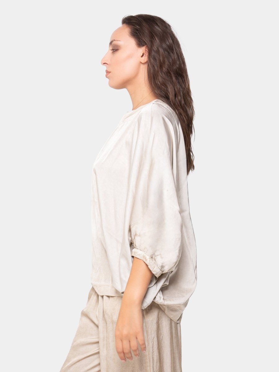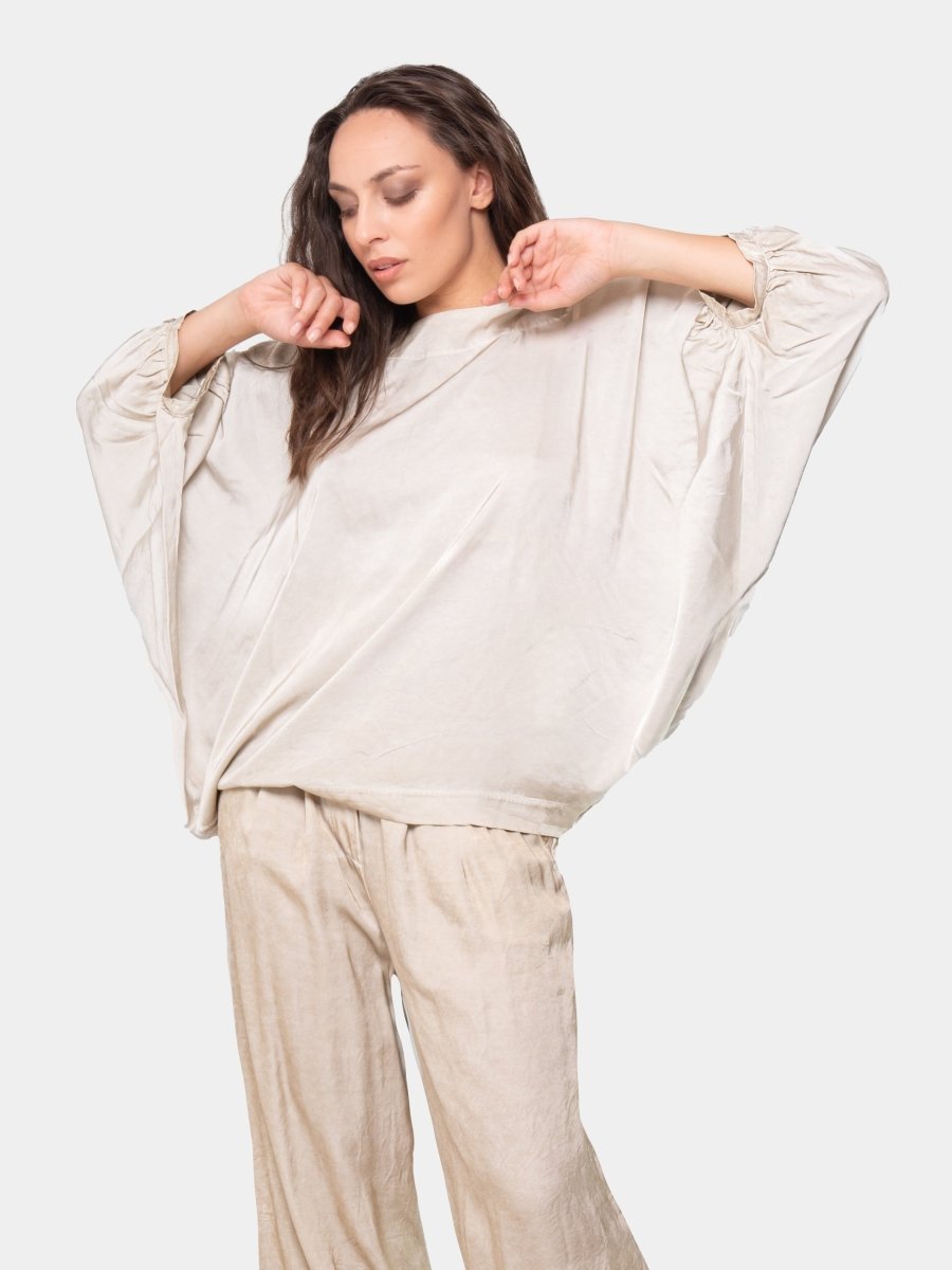 Featuring a relaxed, oversized silhouette with wide sleeves and gathered cuffs, this kimono-style top brings comfort and elegance together effortlessly. The lightweight, fluid fabric creates beautiful movement, while the minimalist shape offers endless styling versatility—from casual layering to elevated looks.