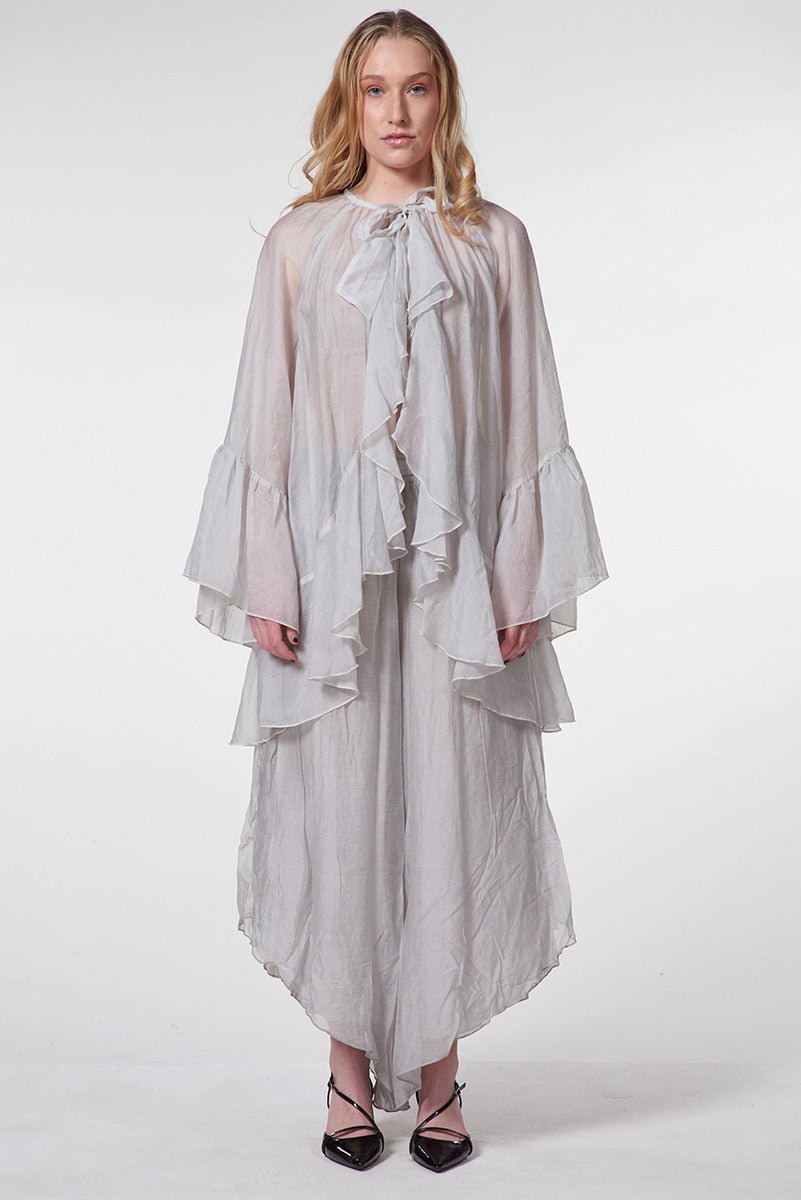 This tunic is designed for effortless style and versatility. The ruffle detailing adds a feminine touch, while the neck tie allows you to create a chic, customizable neckline. Made from soft, lightweight fabric, this tunic offers a comfortable, flowy fit that drapes beautifully.