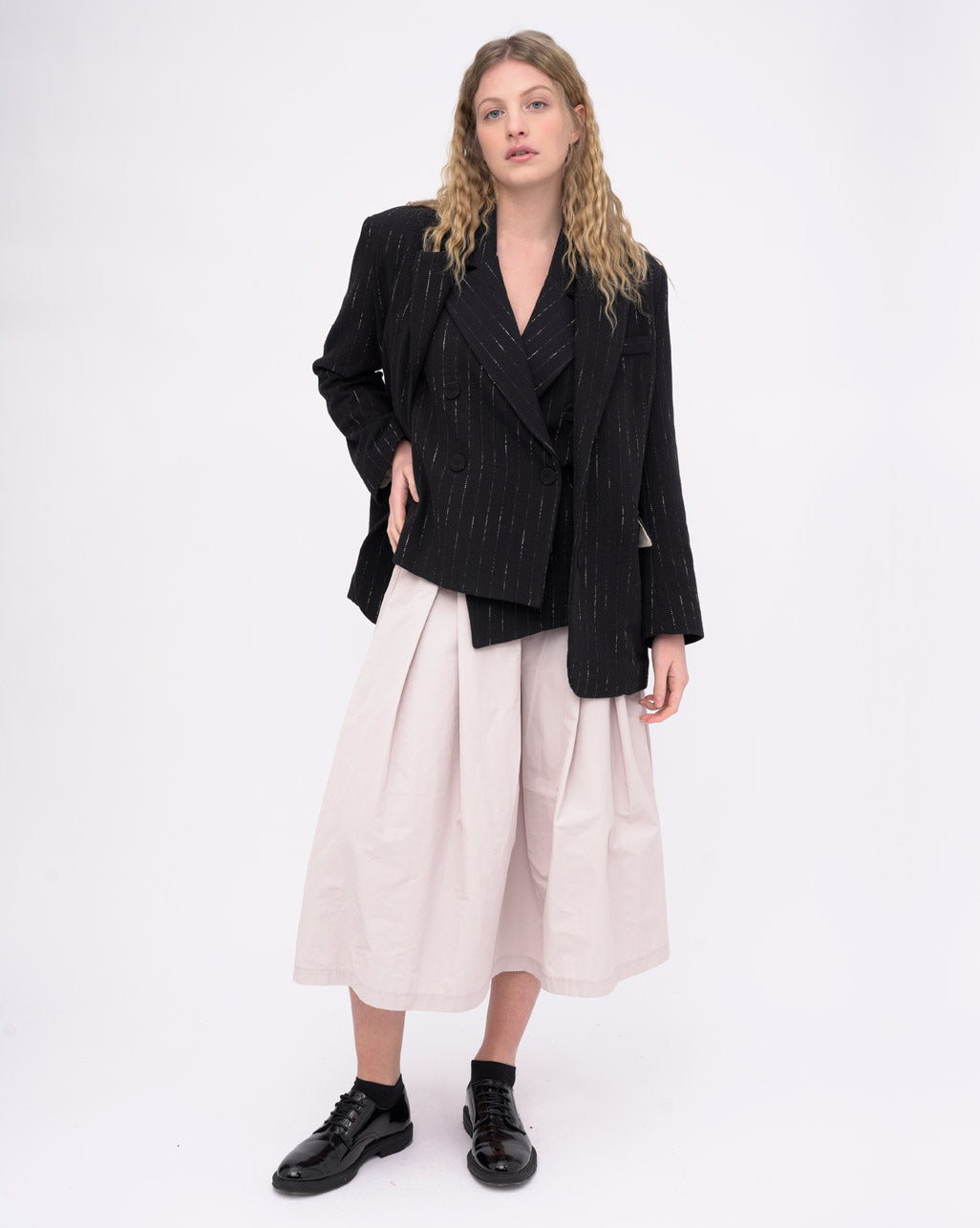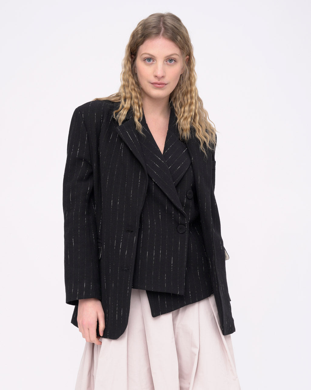 Make a statement and enjoy effortless style with this blazer jacket featuring a relaxed fit, 2 button closure, and a sleek pinstriped design. The slight padded shoulder detail adds a touch of sophistication and elevates any outfit instantly. Versatile and perfect for various occasions, you can style it with jeans and a casual top for a laid-back look or dress it up with a blouse and skirt for a more formal ensemble.