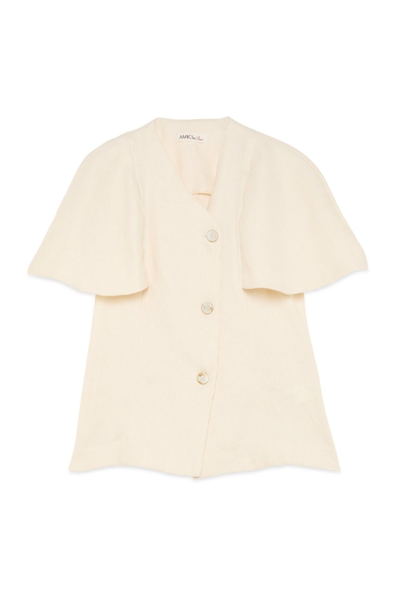 This cape-sleeve jacket is crafted from a cotton-linen blend, combining structure with a lightweight, breathable feel. The flowing silhouette and extended sleeves create a sense of effortless movement and elegance. Designed to layer elegantly with understated sophistication.