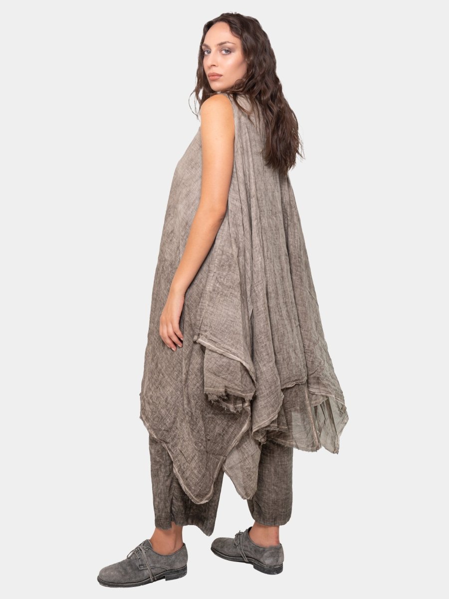 Designed with an asymmetrical hem and layered drape, this sleeveless tunic brings a sculptural element to everyday dressing. Made from breathable, garment-dyed cotton, it moves fluidly and pairs effortlessly with wide-leg pants or worn alone as a statement piece.