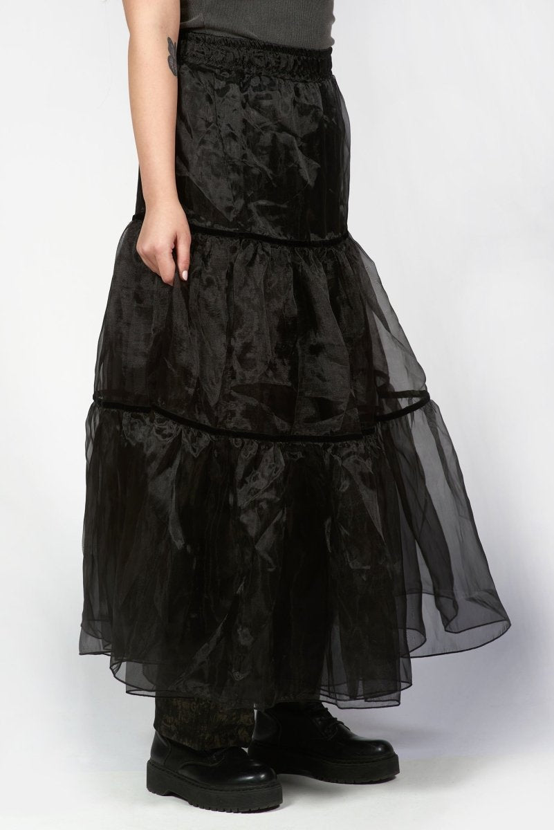A romantic, ethereal layer designed to elevate any look with ease. This sheer tiered skirt is crafted in lightweight organza that floats beautifully with every step. A voluminous A-line silhouette built with an elastic waistband, that offers a comfortable fit.