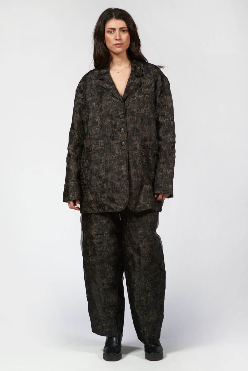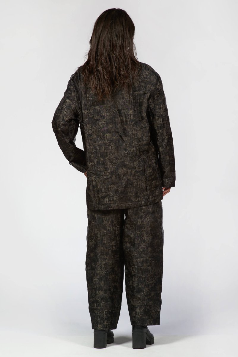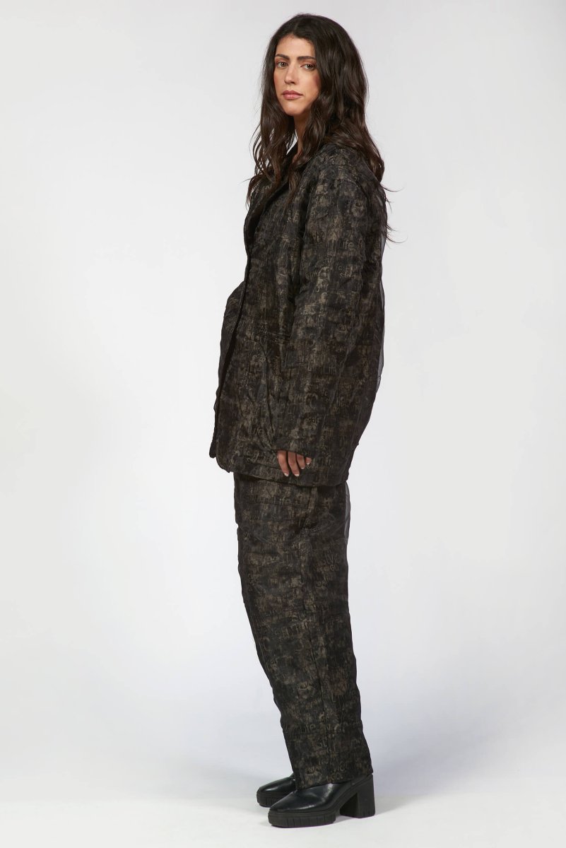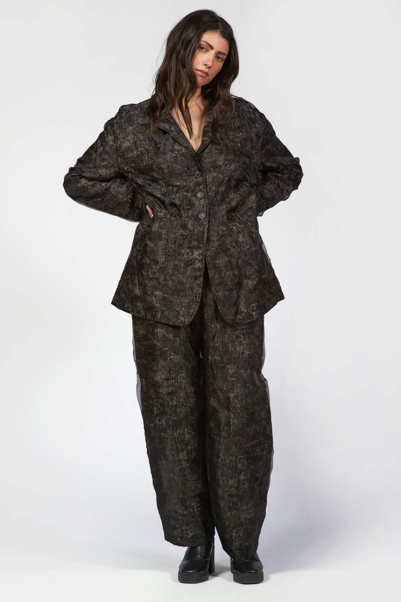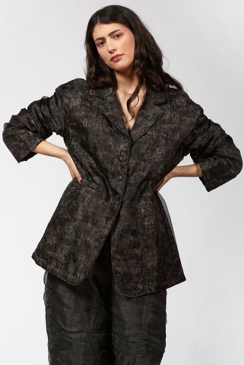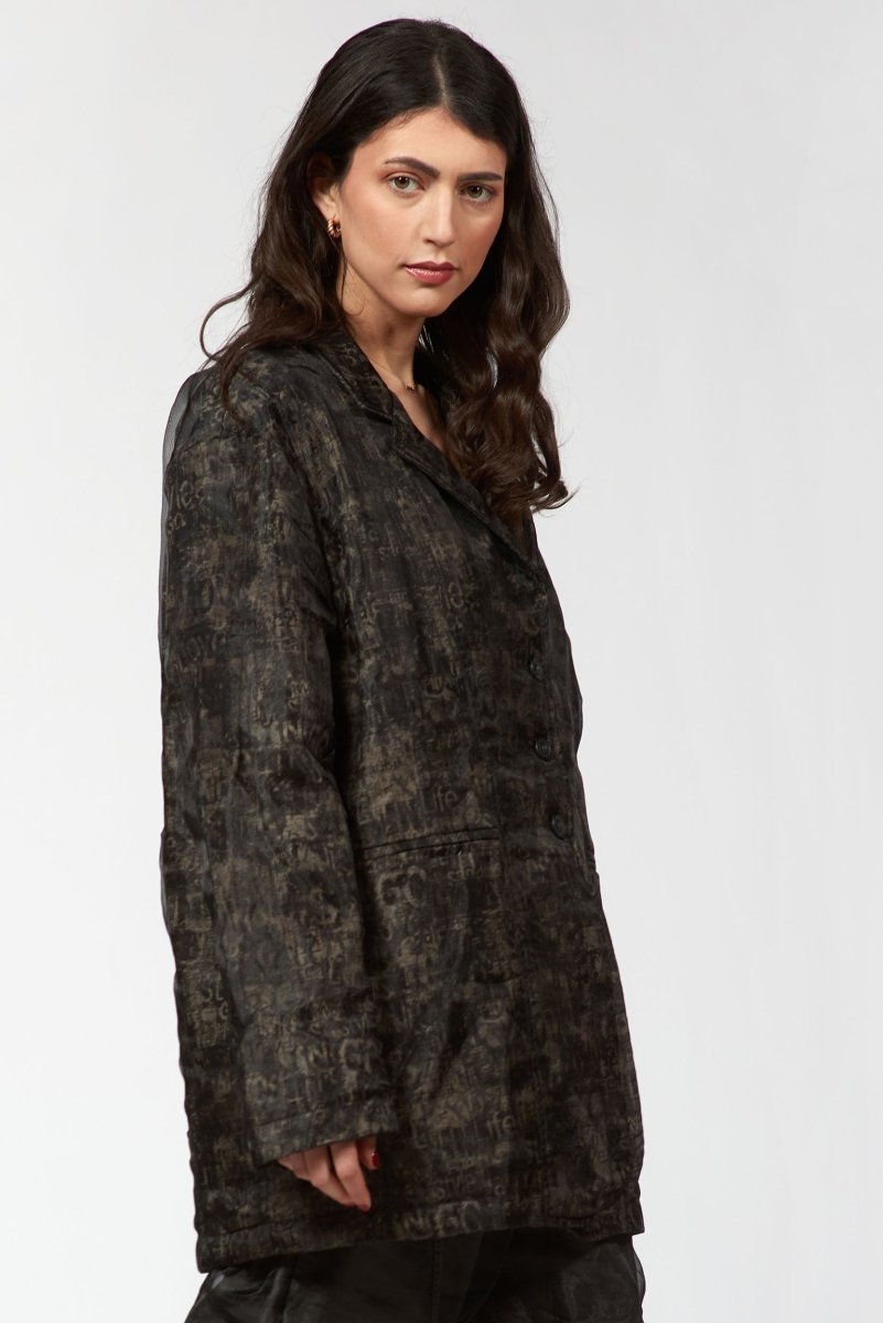 A structured yet fluid silhouette crafted with double-layered organza for a subtle play of texture and depth. The abstract print adds a moody sophistication, while tailored seams and a single-breasted front create a sharp, sculpted fit. Lightweight but full of attitude, it's the kind of piece that moves effortlessly between art and everyday. Pairs perfectly with barrel pants and boots for a bold, contemporary statement.