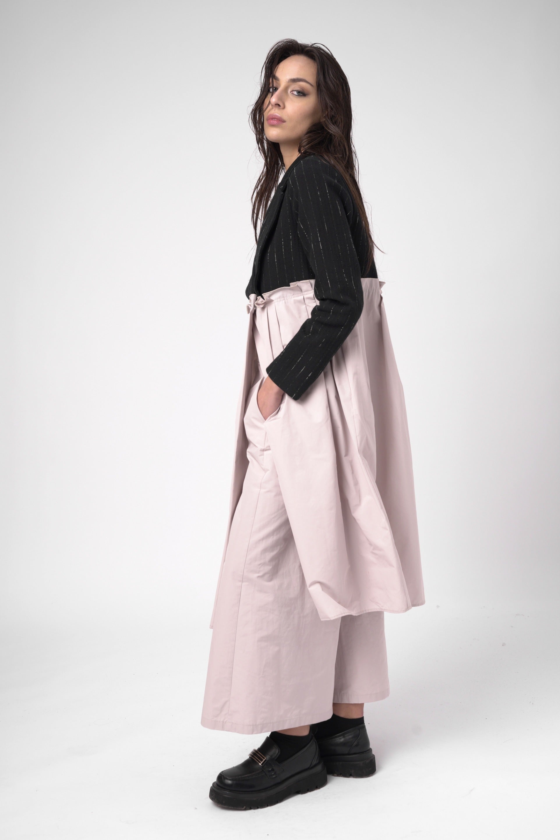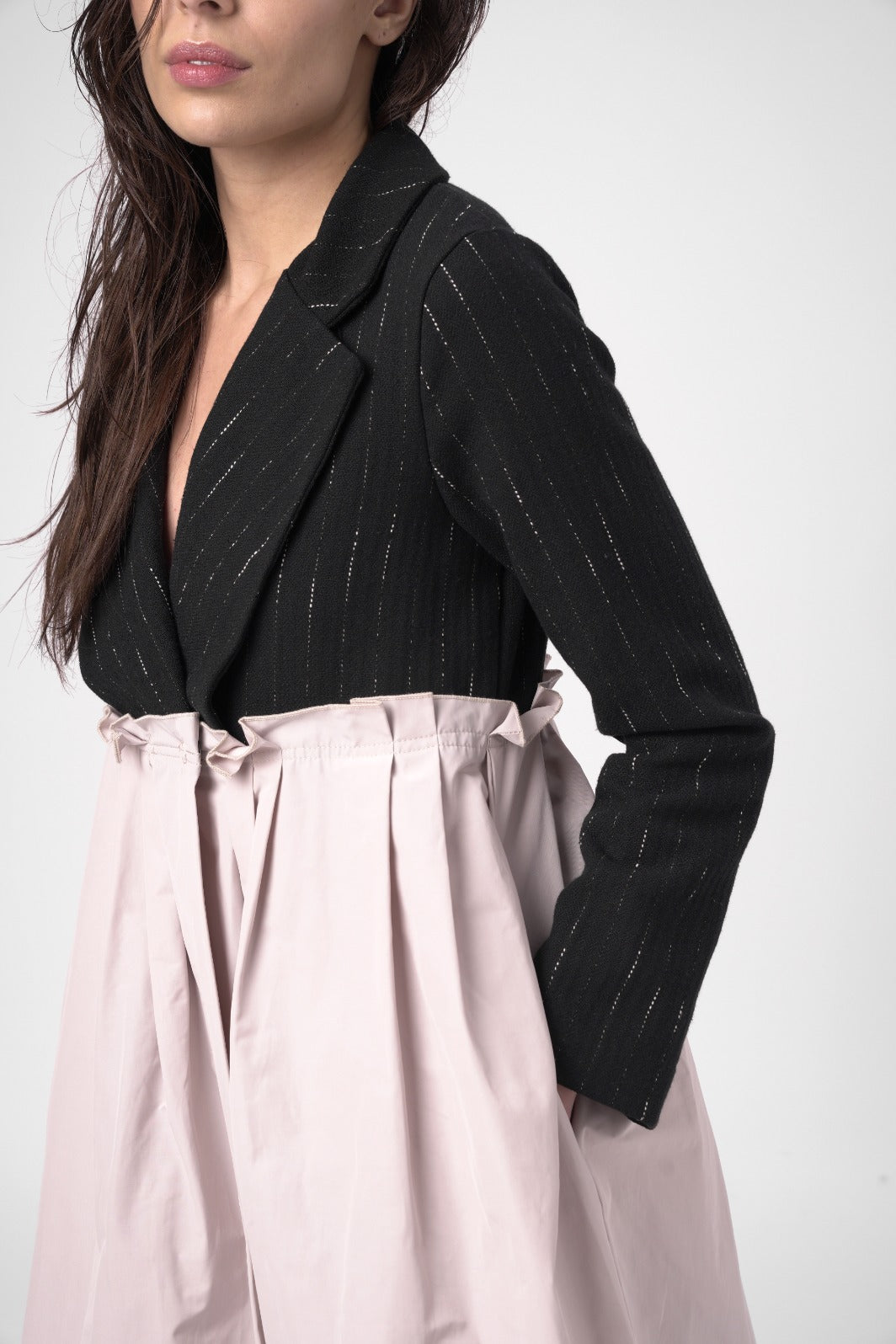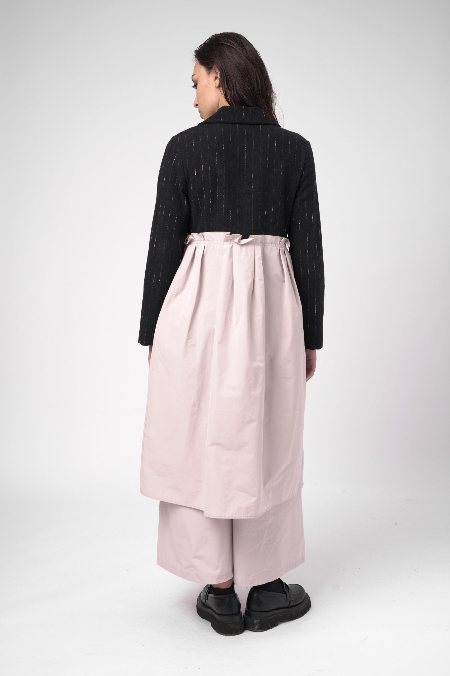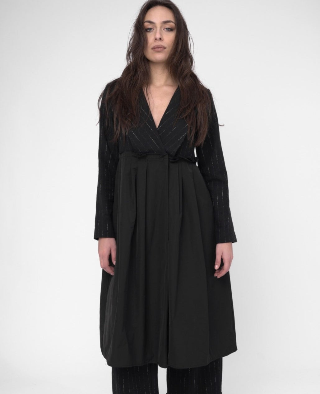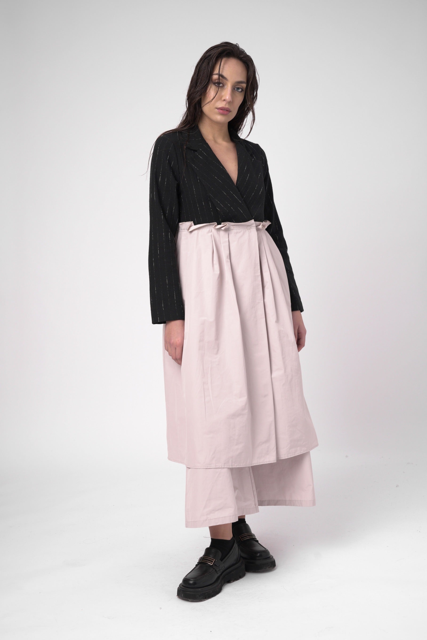 With its trench coat length, this dress exudes a sophisticated and elegant appeal. The contrasting materials add a unique twist to the design - the top half features a v-neck pinstripe blazer, while the bottom half showcases a flowy pleated open skirt detail. This avant-garde and contemporary coat dress allows for endless styling possibilities. Wear it with pants or leggings for a chic and fashion-forward look that is perfect for a formal event or a casual outing.