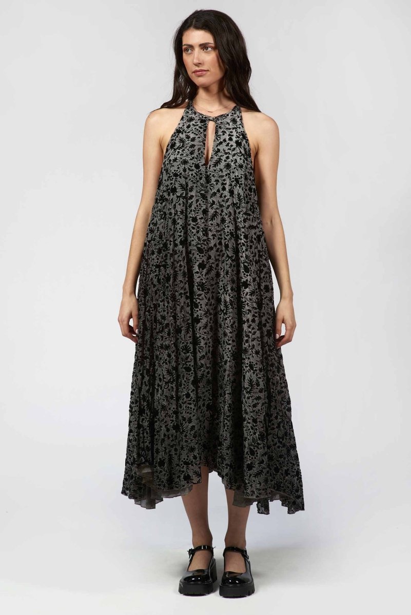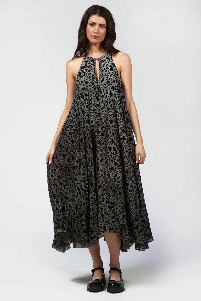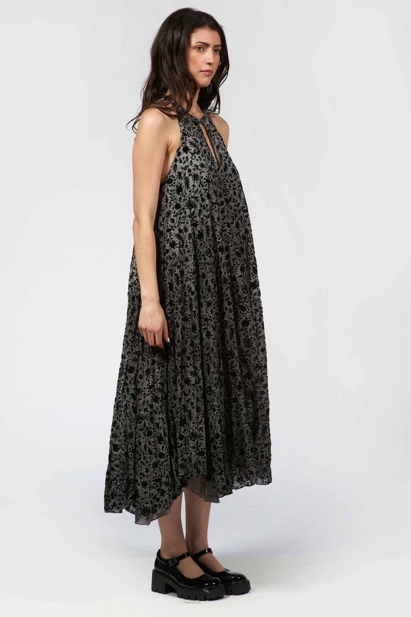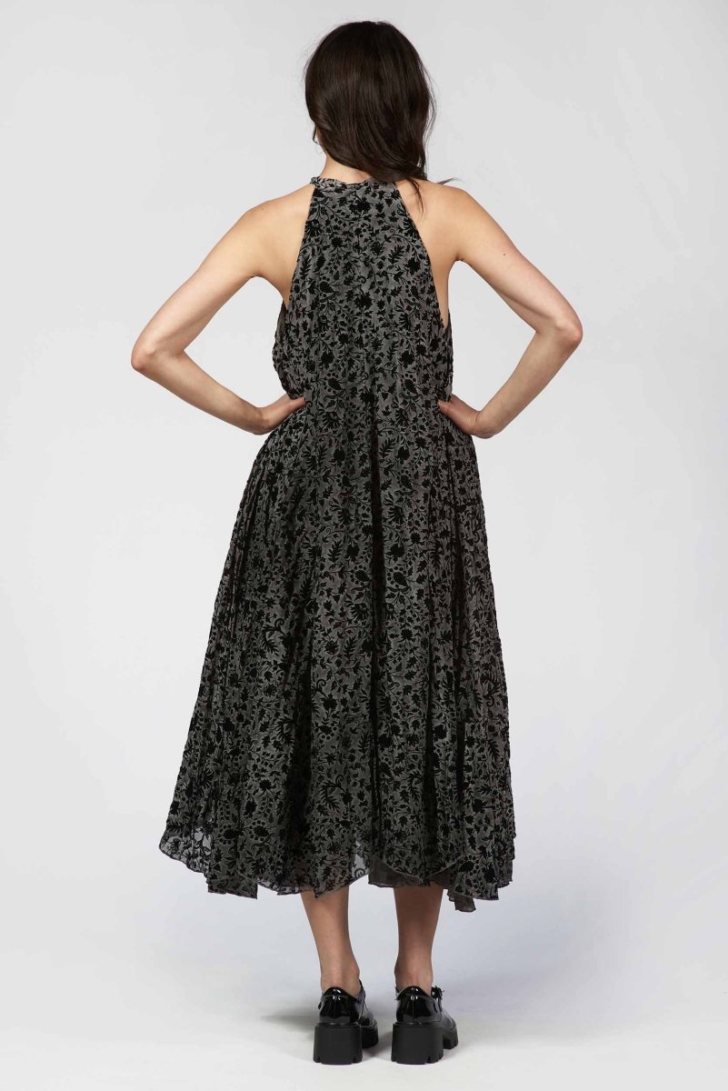 This halter dress is defined by its velvety flocked finish, giving the sleek lines unexpected depth. Its refined cut shapes a graceful, elongated silhouette with a modern, evening-ready edge.