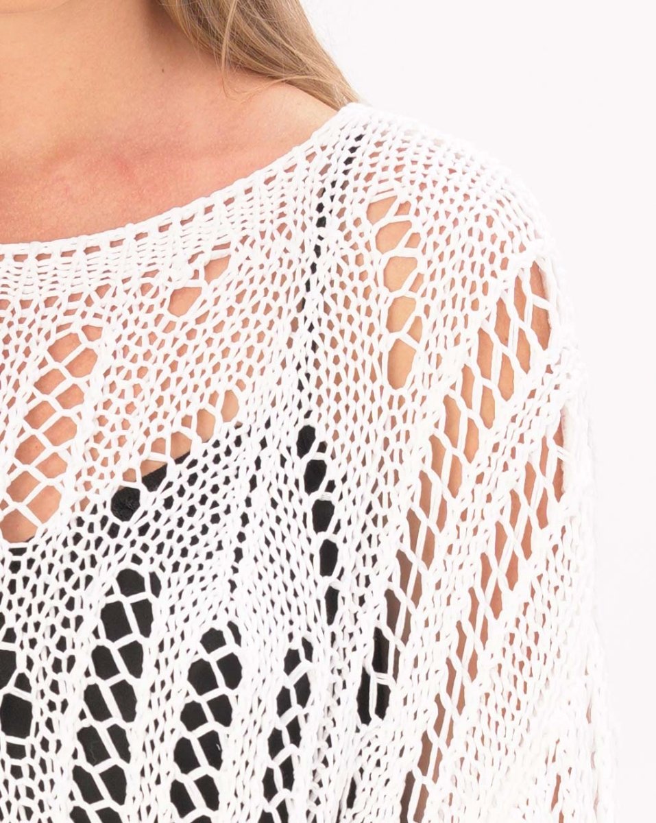 Add a sense of cool, and relaxation to your fit with this knitted long sleeve top. With the fishnet knit, this is great to layer over one of your tops and create a cool layered look. Bright colors work amazing under this top, and bring a sense of unique style. The cotton blend is soft to the touch, and the fit on the body is slightly loose, allowing you to move freely.