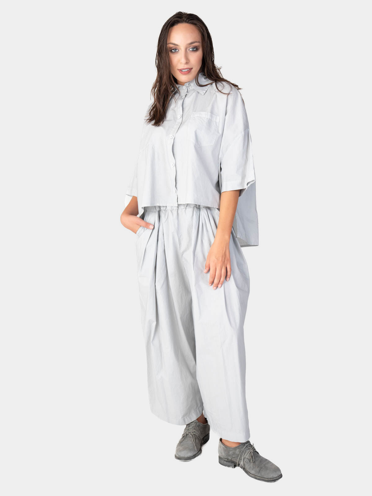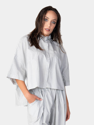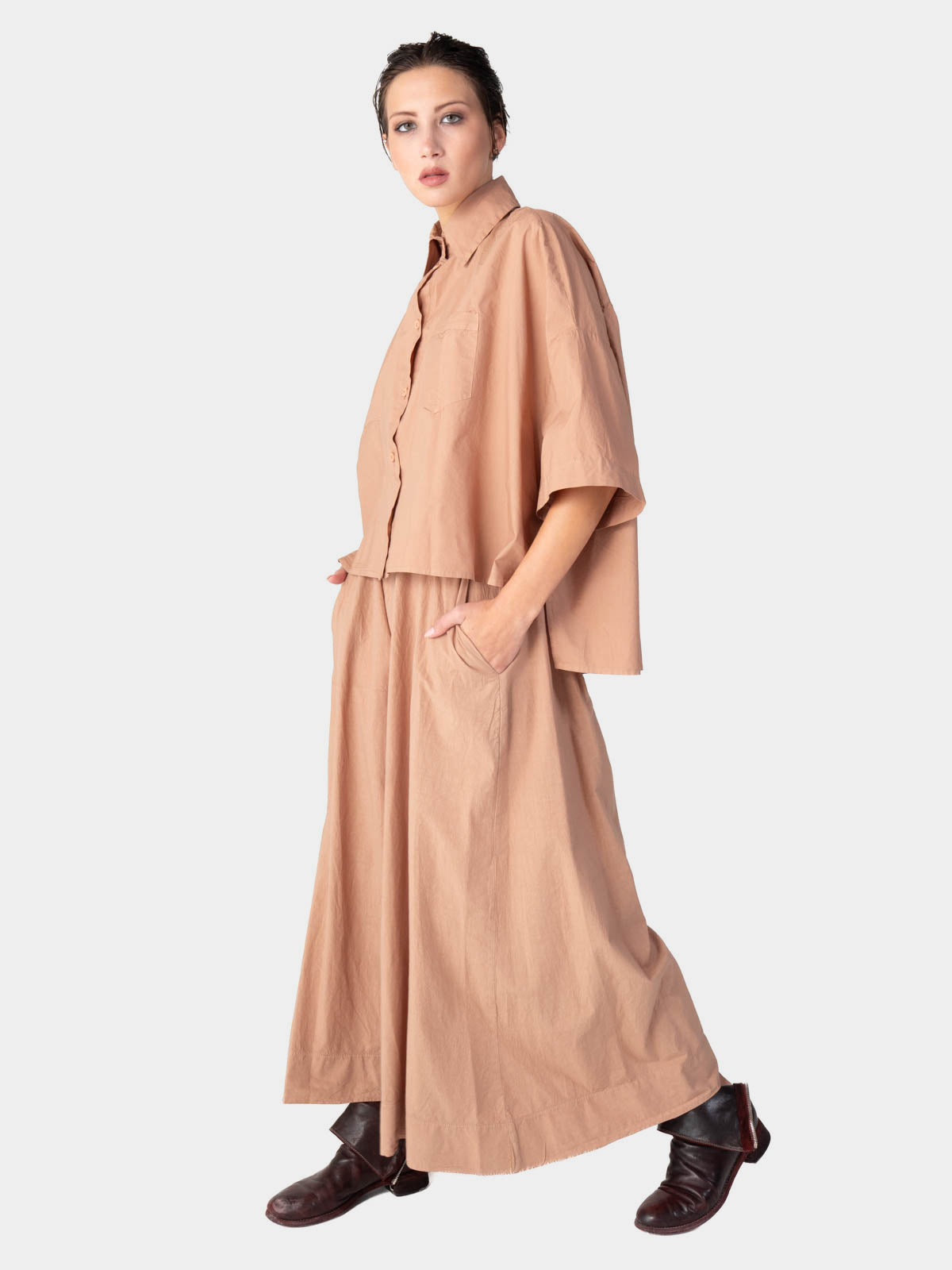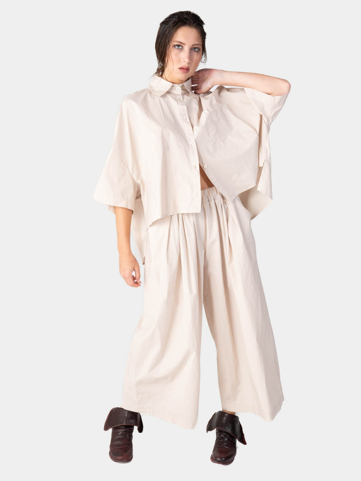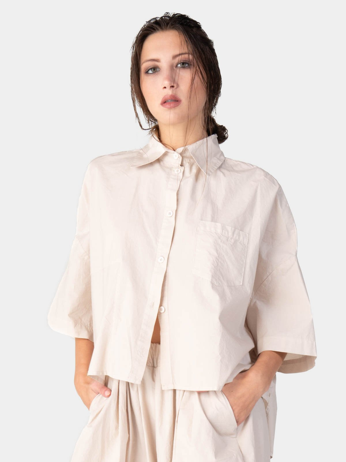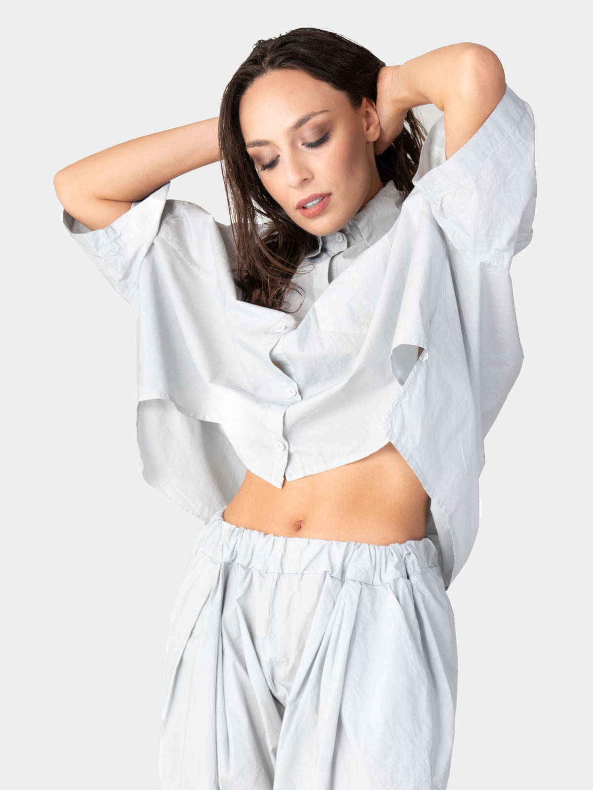 Center your outfit around the Hi-Lo Organic Cotton Cropped Shirt, a staple that serves as the perfect base for any look. The loose fit of the top and the cotton fabric makes it perfect for the summer and easy to style. The traditional button down silhouette gives it that classic look whereas the cropped bottom gives it a bit of edge. Pair it with a loose trouser for that breathable look or style it with a form fitting bottom for a more balanced vibe.
