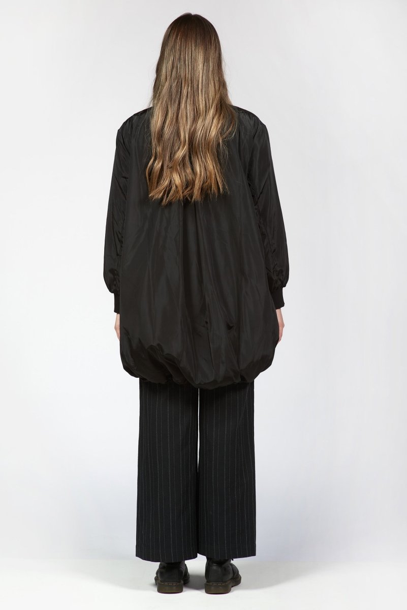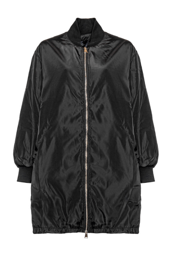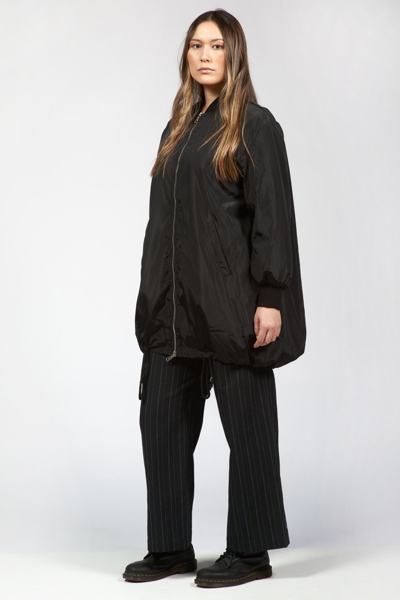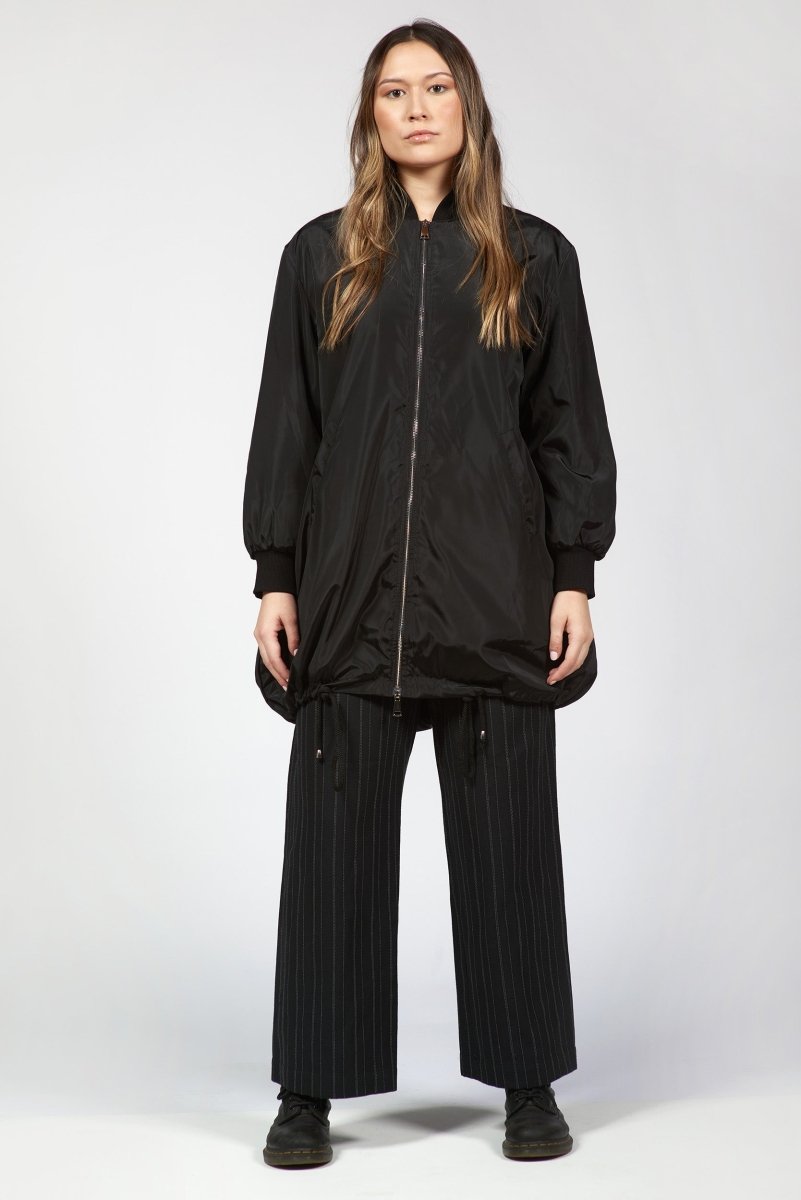 An elongated bomber jacket with a refined, structured silhouette. Designed with a two-way zip closure, side welt pockets, and subtle leather accents that elevate the utilitarian design. The extended length and tailored shoulders create a modern, streamlined shape that layers effortlessly over any look