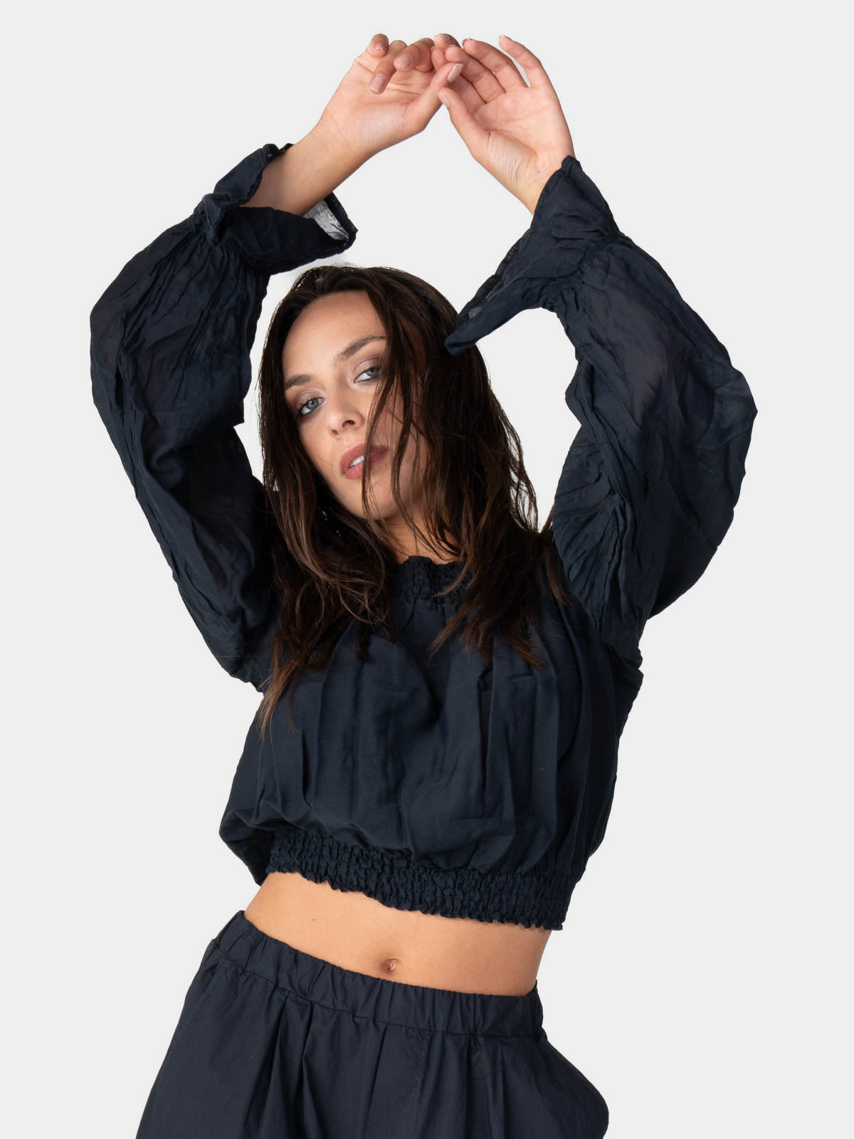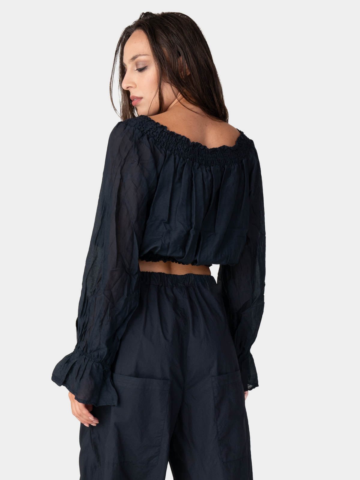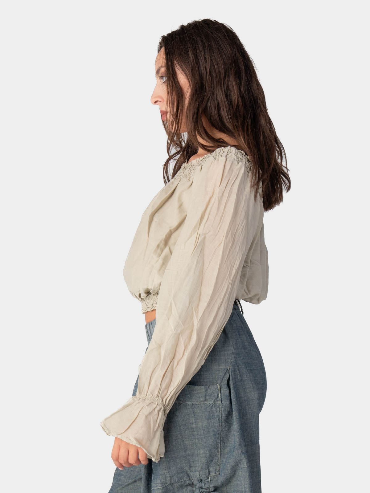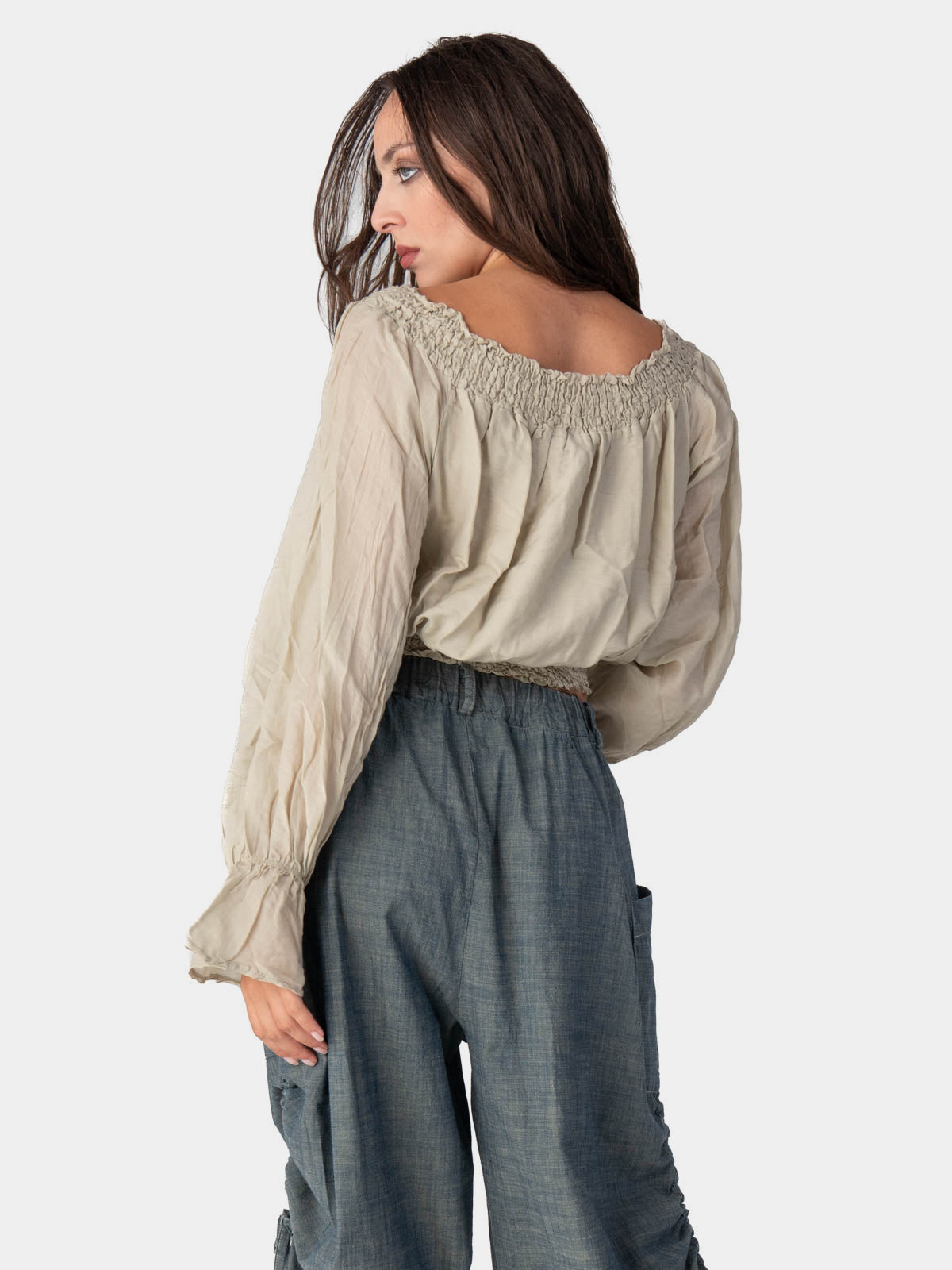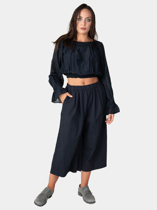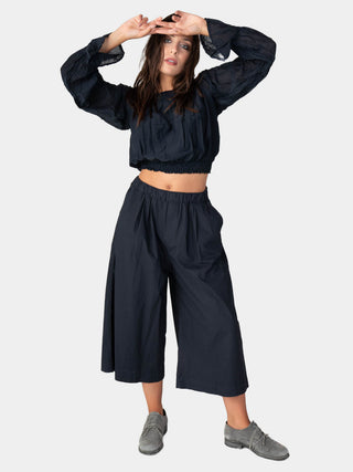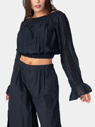 This cropped blouse is so cute! It has a unique gathered neckline and is finished with elasticized cuffs that give the silhouette volume and form. It is a very adaptable piece that looks great with high-waisted pants and offers a unique blend of modern and classic style.
