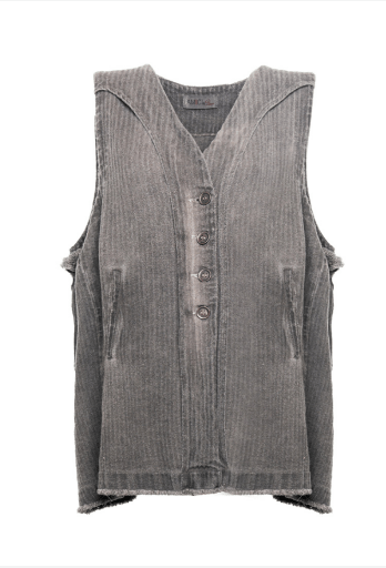 An intentionally oversized silhouette gives this vest its modern, sculptural presence, while frayed edges add a touch of raw, artisanal texture. The contrast of structure and deconstruction creates an elevated layer with a quiet attitude.
