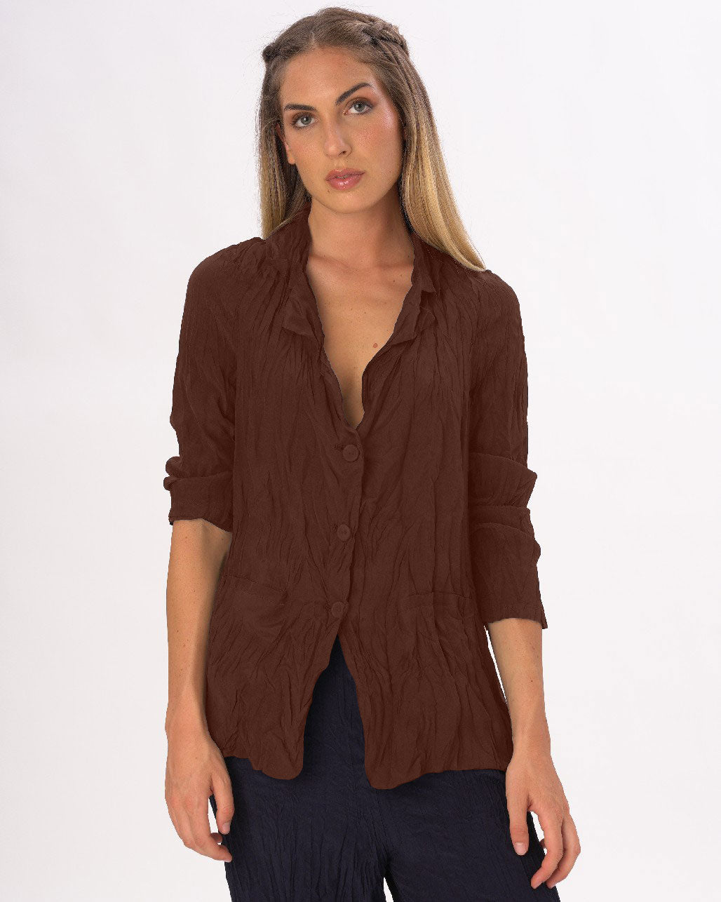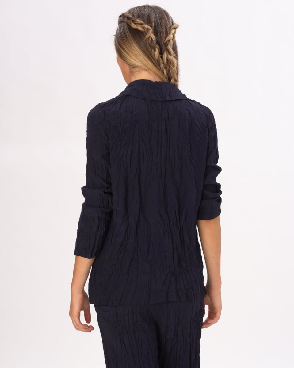 A relaxed take on the classic blazer, this silky, crinkled version is rich and luxurious. Pair this blazer with the matching Silky Elastic Waist Crinkled Pleated Pants for a monochromatic classy look, or wear it alone with jeans and a heel for the perfect date night outfit. With a traditional fit and a full length sleeve, this blazer is a must have.