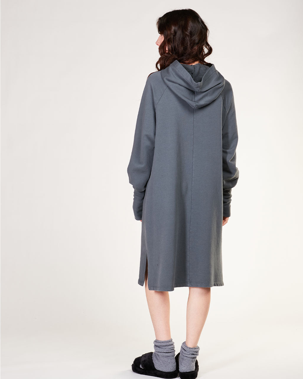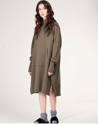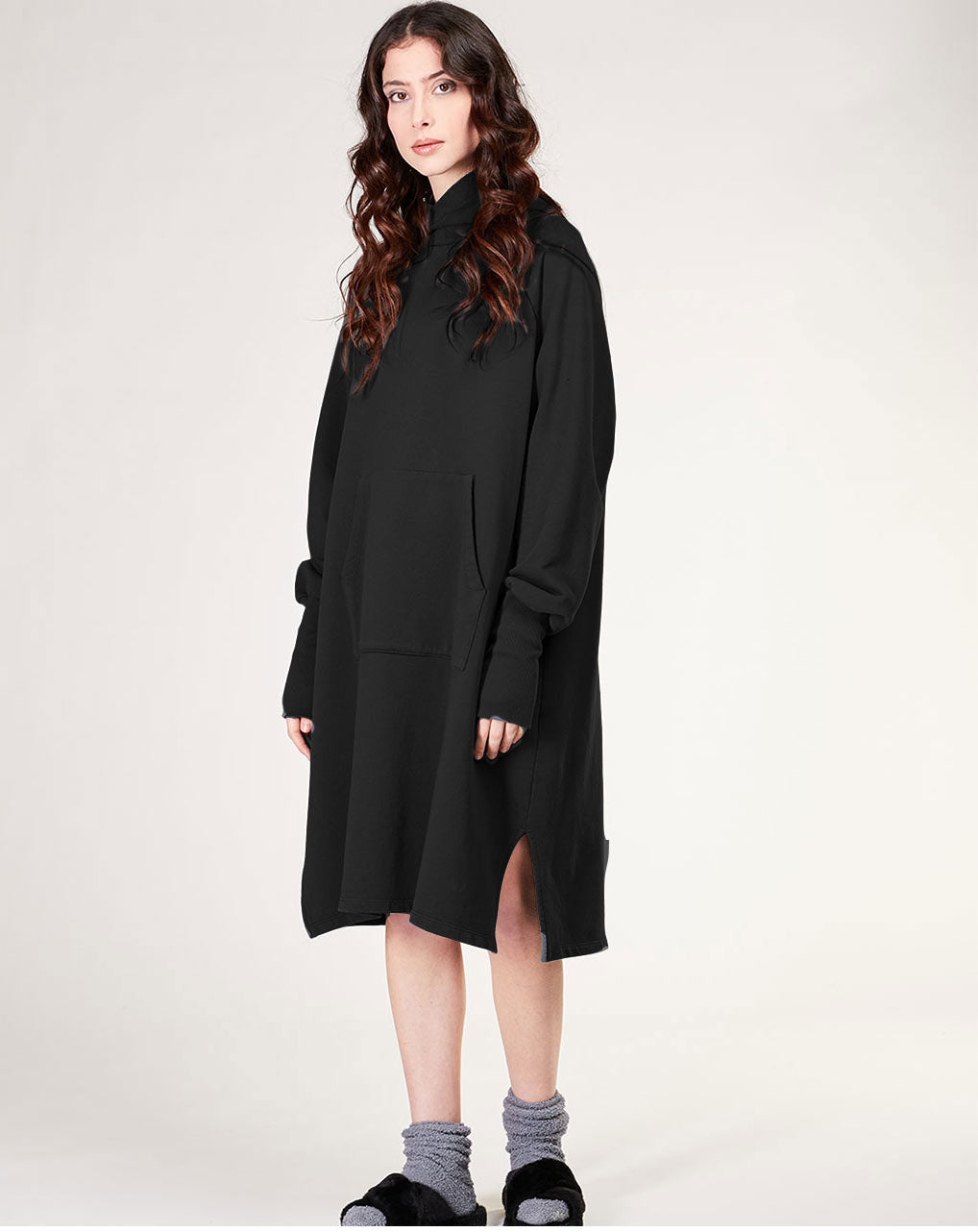 Keep cozy in the Shawl Collar Hooded Sweater Dress. It is the perfect leisure piece to add to your wardrobe this season. A shawl collar detailing allows the sweater to keep you warm. The straight hem pairs well with the loose fit and split seam hem, giving the sweater dress a chic look. Ribbed detailing on the sleeves and the front pocket add freshness to the classic piece.