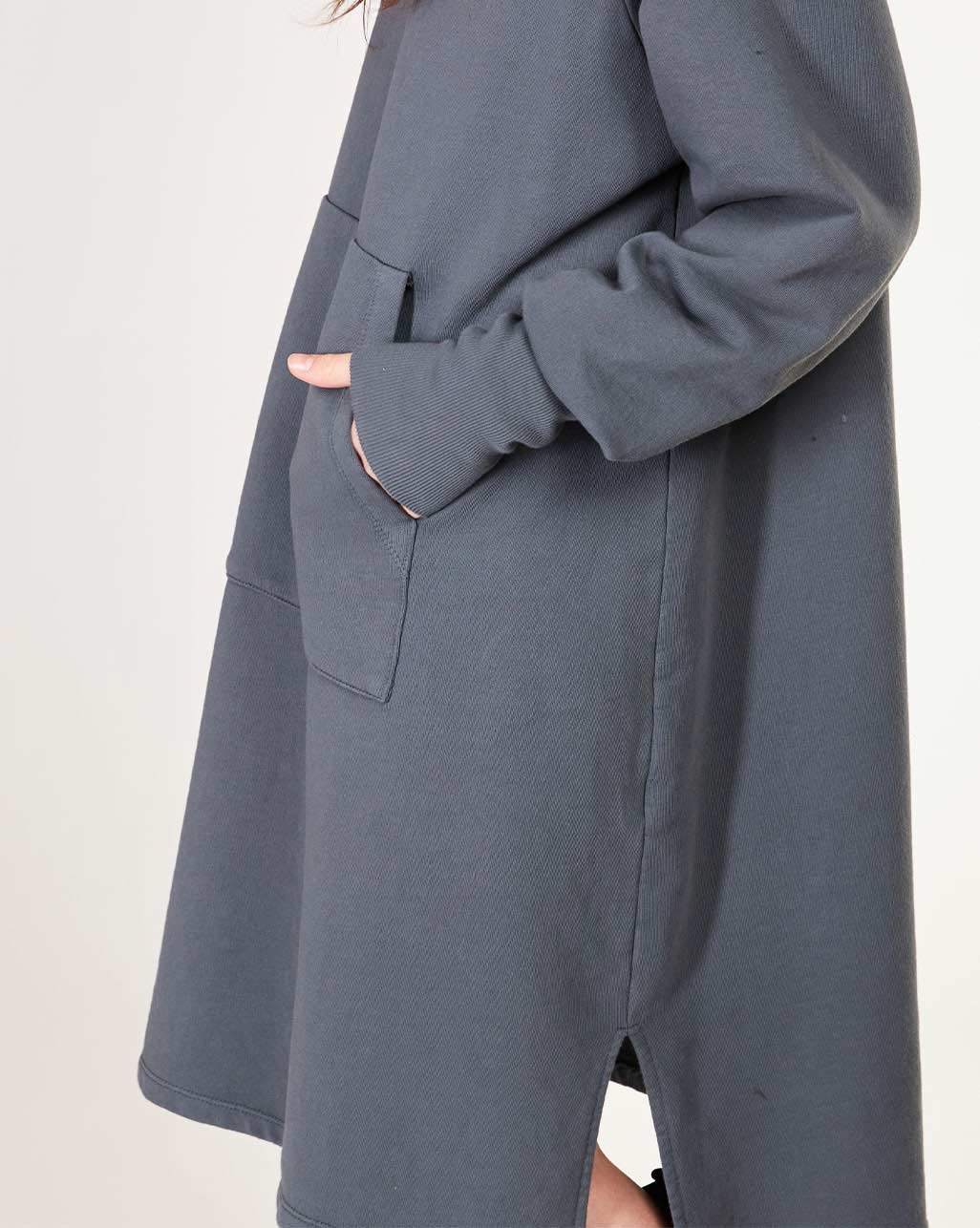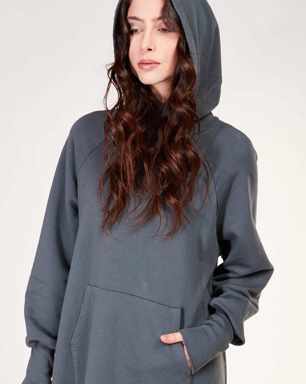 Details: Split seam, Attached hood, Front pocket, Straight hem